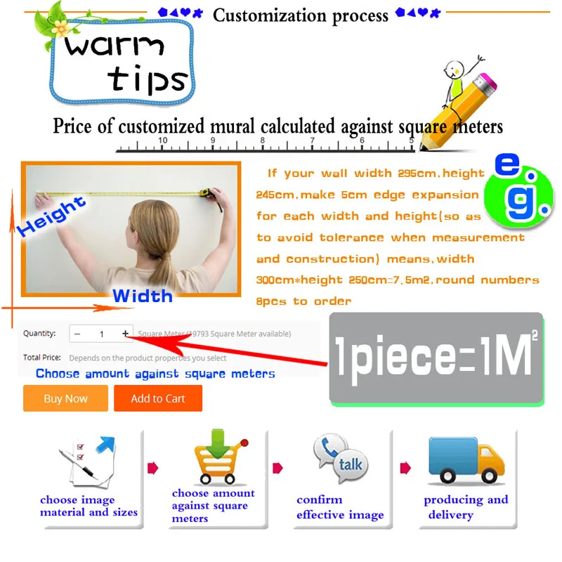 1) Наши обои соответствуют вашим размерам стен, высоким и широким для производства. 2) сначала убедитесь, что размер вашей стены высокий и ширина. 3)(?)m high X (?)m width =? Квадратный метр, затем вы покупаете сколько квадратных метров. 4) например: Высота Вашей стены составляет 3 м, ширина-4 м, пожалуйста, заказывайте 12 квадратных метров (12 м2)