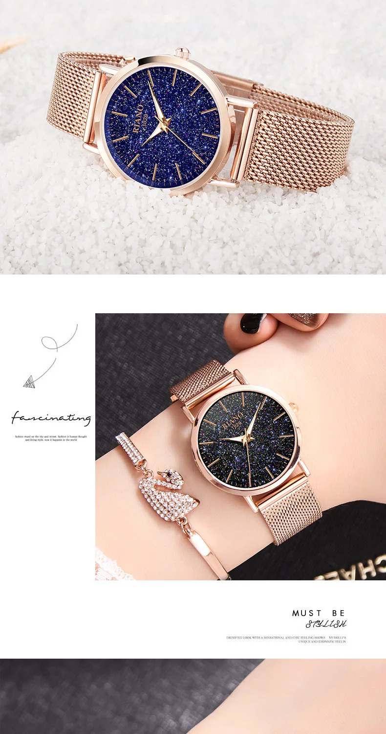 Женские роскошные часы, уникальные часы с голубым звездным небом для девочек Наручные часы с браслетом из розового золота, водонепроницаемые часы montre femme