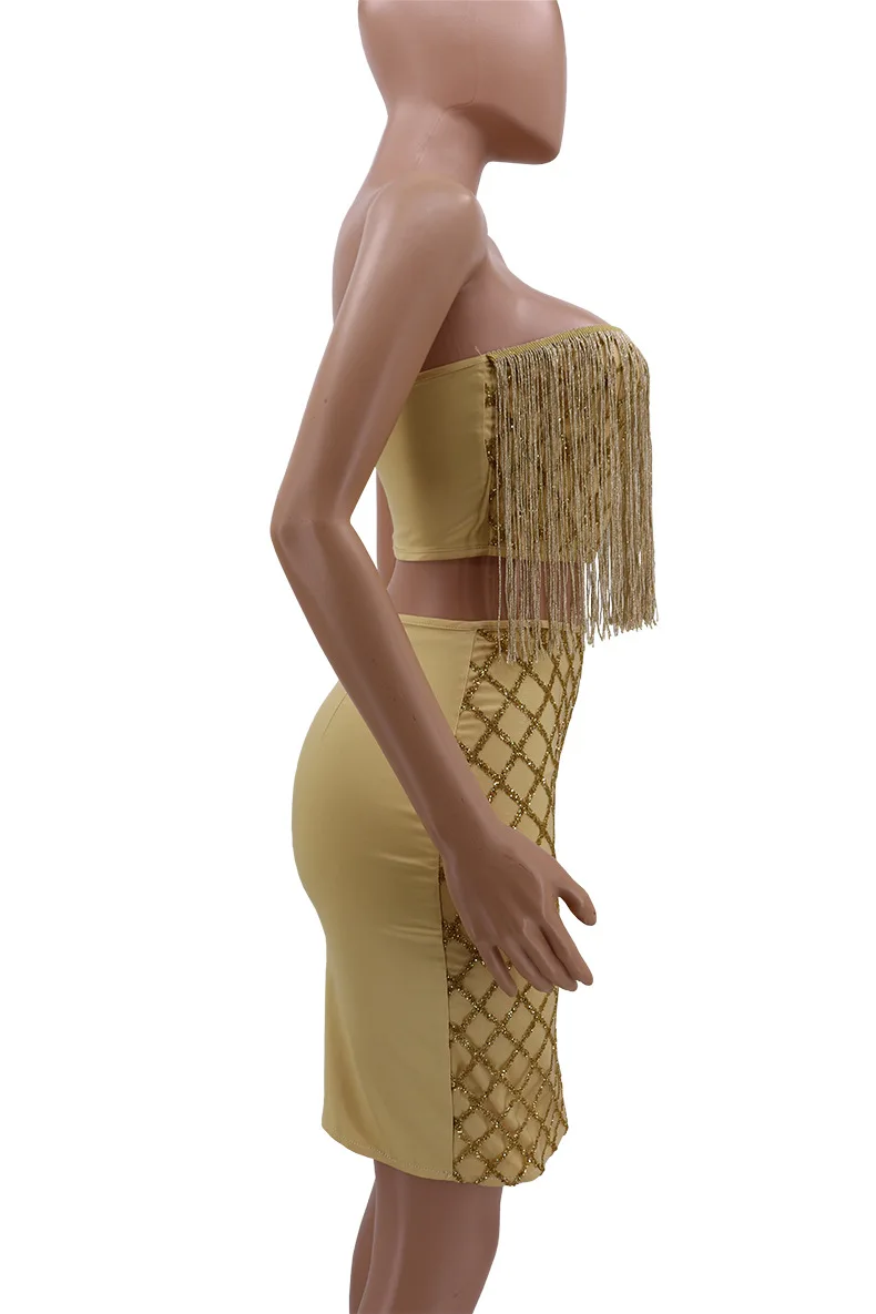 1. Материал: золотое Золотое Платье с кисточками; сезон осень-зима; сексуальное платье; внутри 100% спандекс. 2. Очень мягкий и удобный, который чувствует себя так же хорошо, как он выглядит. Показывает вашу индивидуальность и стать центром внимания общественности в то же время. 3. Без Бретелек, топ без рукавов, с открытой спиной, приталенное, платье из двух частей с блестками. 4. Ручная стирка в холодной воде. Повесьте, чтобы высохнуть. 5. Примечание: Пожалуйста, внимательно прочитайте таблицу размеров на картинке перед заказом.