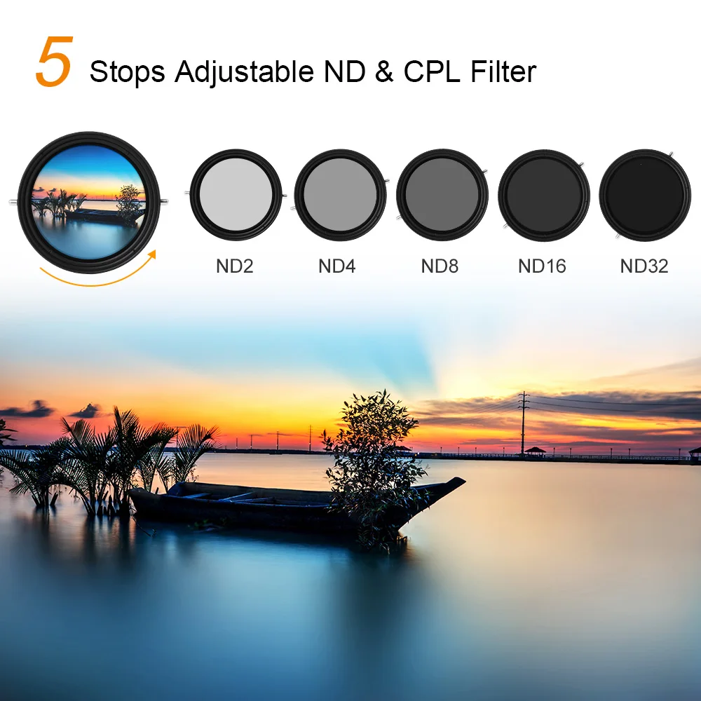 【 5 остановок Регулируемый ND & CPL Filter】:Фильтр ND может регулироваться между 5 остановками (ND2, ND4, ND8, ND16, ND32) рычагом переключения передач. Вращающаяся Рамка фильтра для регулировки фильтра CPL. Это верхние и нижние структуры, которые можно регулировать независимо, не мешая друг другу.