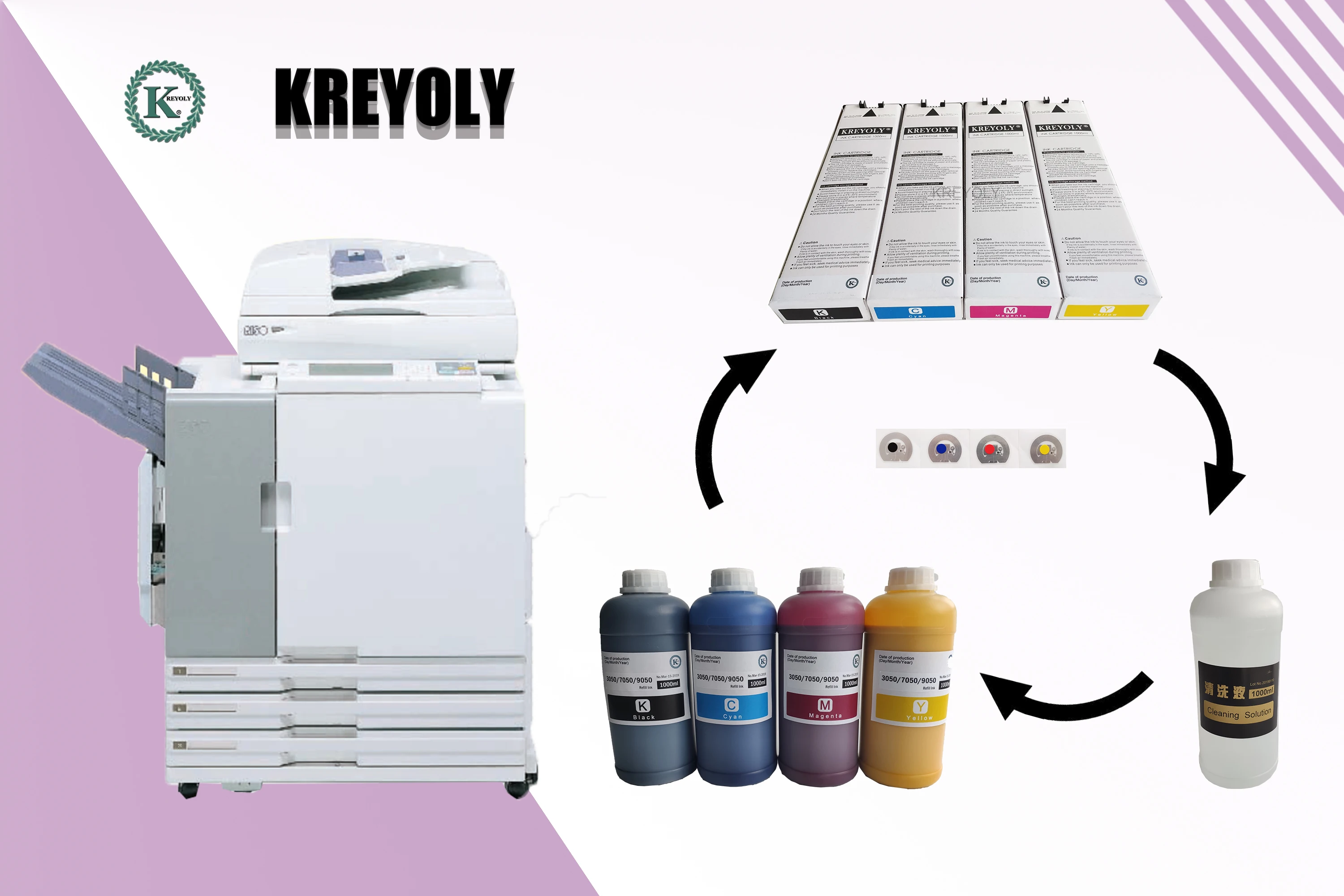 Brand:Kreyoly Model: 3050/7050/9050 Color: Black, Cyan, Magenta, Yellow Chip: with chip Feature: compatible cartridge Volume: Black-1000ml ,Cyan-1000ml, Magenta-1000ml , Yellow-1000ml Compatible Machine: Compatible for Comcolor 3050,7050,9050