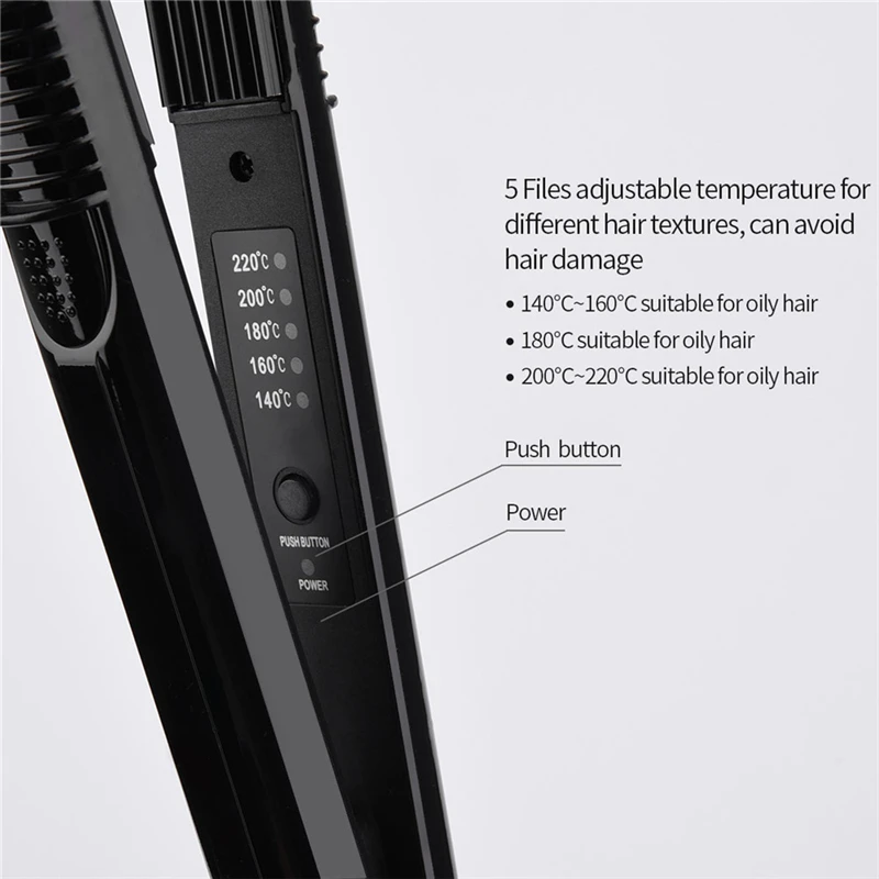 Особенности: 5 режимов температуры: 140℃, 160℃, 180℃, 200℃, 220℃ для разных типов волос. Позисторный нагреватель обеспечивает быстрый нагрев. Покрытие нагревательной пластины турманиевой керамикой обеспечивает равномерный нагрев, что уменьшает повреждение волос и делает ваши волосы сияющими и здоровыми. Благодаря термоизолированному наконечнику держать и использовать прибор стало проще. Прибор имеет кнопку регулировки температуры, светящийся дисплей с температурой и индикатор сети. Спецификация: Теплопроводный материал: турманиевая керамика Нагревательный элемент: позисторный Напряжение: 220 В Частота: 50 Гц Мощность: 30 Вт Применение: для сухих волос Рабочая температура: регулируется, 140℃~220℃ (5 режимов) Длина шнура: 1,8 м Размер: 29*2,5 см/11,42*0,98 дюйма (длина*ширина) Цвет: черный Вес: 266 г Комплектация: Плойка-гофре для волос -1 шт. Инструкция по эксплуатации (на английском/китайском) - 1 шт. Упаковано в воздушно-пузырчатую пленку, без коробки.