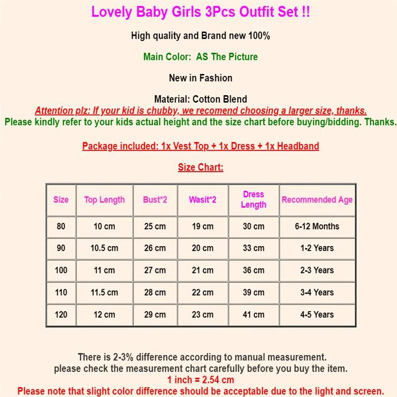 Милый комплект одежды из 3 предметов для маленьких девочек! Высокое качество и абсолютно новый 100% Основной цвет: как на картинке Новинка в моде Материал:Смесь хлопкаОбратите внимание: если ваш ребенок пухленький, мы рекомендуем выбрать больший размер, спасибо. Пожалуйста, перед покупкой ознакомьтесь с фактическим ростом вашего ребенка и таблицей размеров. Спасибо. В комплект входит:1 жилет + 1xПлатье + 1xПовязка на голову Таблица размеров: