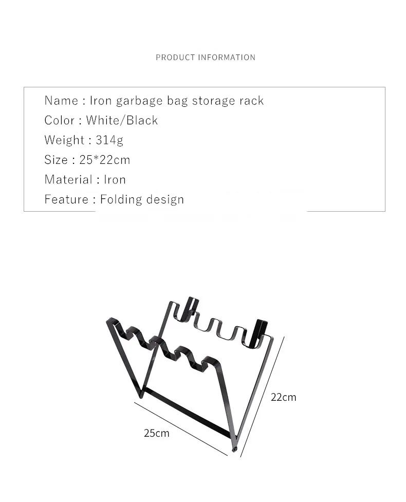 Название продукта: складная стойка для хранения мусора Функция: кухонное хранилище всякой всячины Материал: металл Характеристики: складной, экономит место, экологически чистый Цвет: белый и черный Размер: хранение 25*22 см Сумка: 45*55 см (120 шт.)