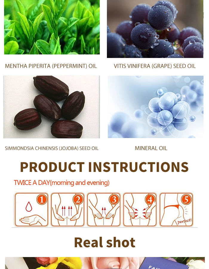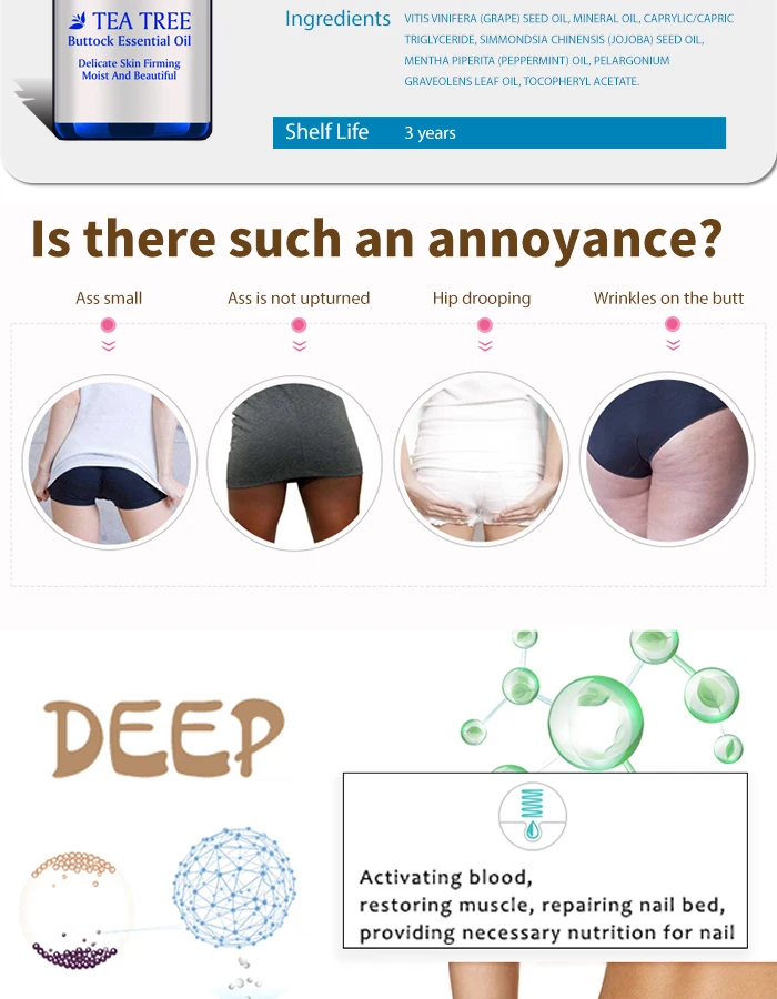 Содержит натуральную эссенцию чайного дерева, мягкую и нежную текстуру, дарит достаточно влаги и питания коже, снимает и уплотняет, делая кожу ягодиц полной эластичности, улучшая грубую и темную кожу, И показывает полный воды и жизненной силы.