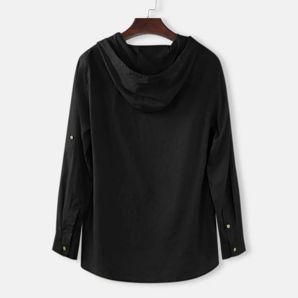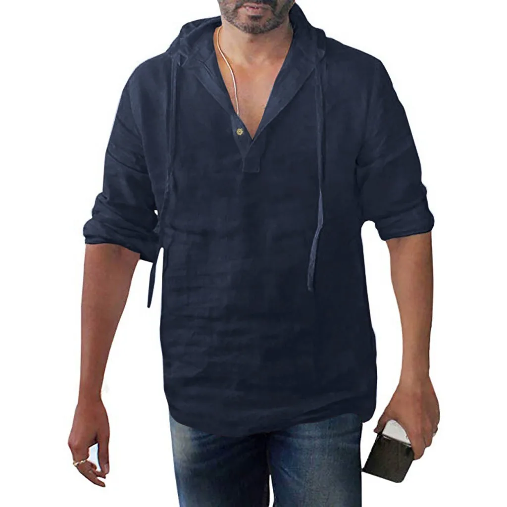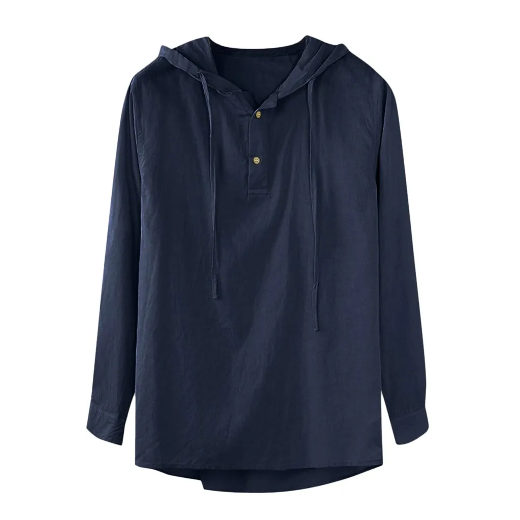 Мужская мешковатая хлопковая льняная Однотонная рубашка на пуговицах размера плюс с длинным рукавом и капюшоном