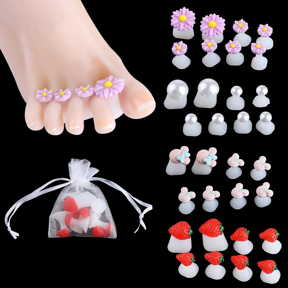 100% brand new and high quality Silicone pedicure flower crystal pearl toe separators 8 styles for your choice Type: Toe Separators Material: Silicone Package includes: 8pcs toe separators Features: Upgrade your pedicure: with the fun and fashionable Toe Separators. Silicone material, soft and not hurt your foot. Prevent toe smudging: The innovative shape lets you engage in your regular activities without smearing fresh nail polish. Flexible to walk, run and even dance with Toe Separators. These individual toe spreaders can be worn to alleviate toe overlapping, plantar fasciitis and bunions. Daisy design: Ditch the unsightly and uncomfortable foam separators for cute designs such as daisy flowers. Decoration: You can even wear the smaller ones with your flip flops or sandals.