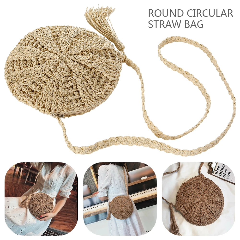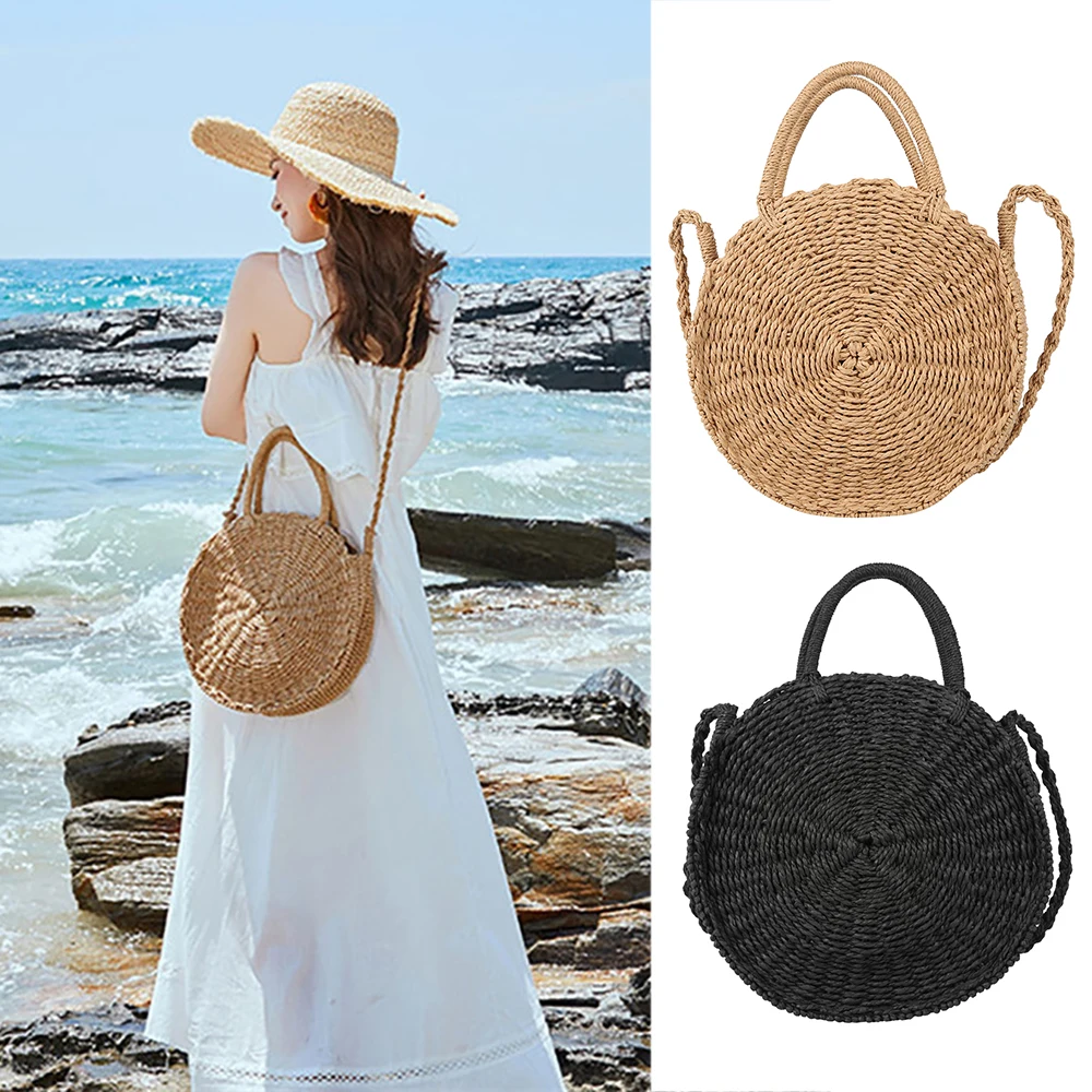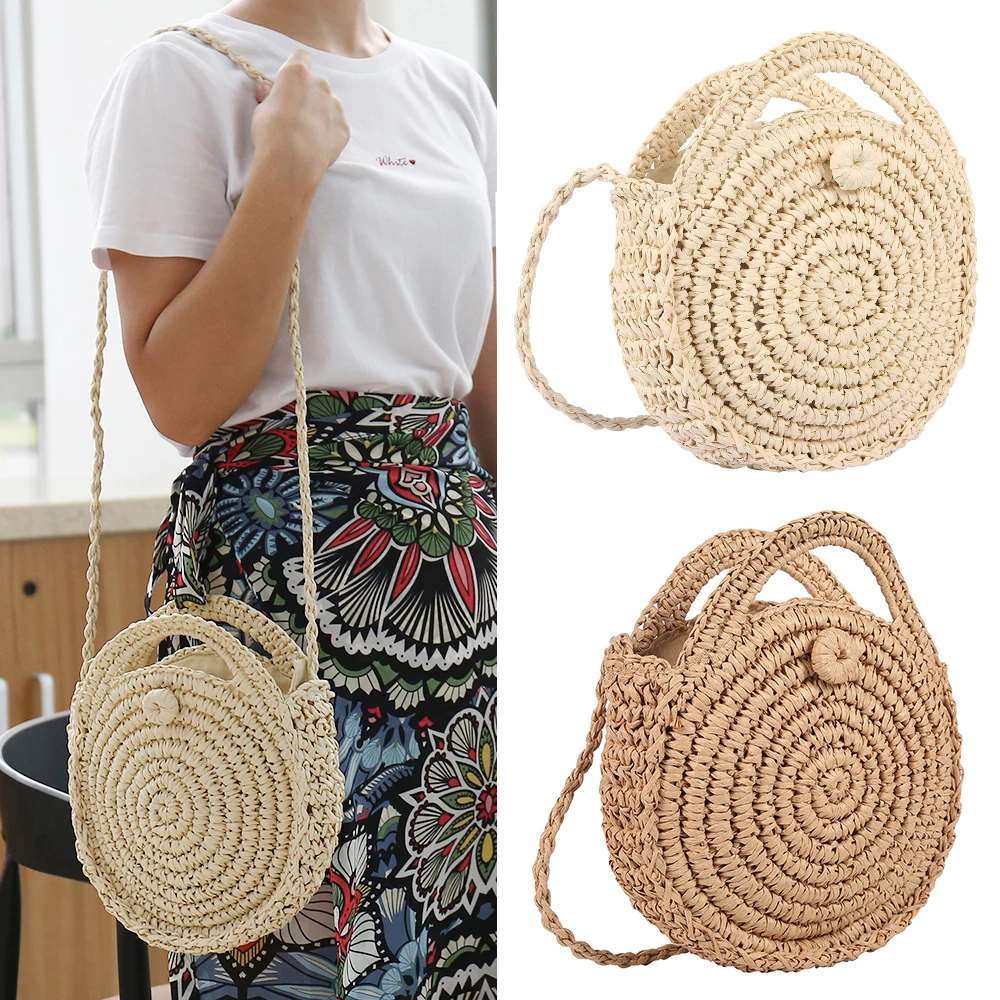 Новая круглая Соломенная пляжная сумка, летняя мини винтажная ручная сумка через плечо для девочек, круглая сумка из ротанга, маленькая богемная сумка на плечо