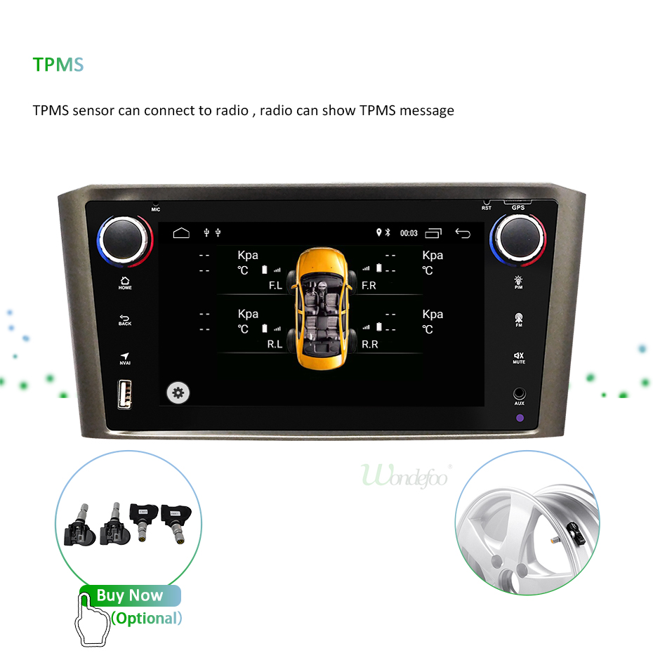 Радио может совместимо с системой контроля давления в шинах (TPMS). Когда вы подключаете TPMS к радио, вы можете видеть, что TPMS приводит к радиоэкрану. Радио также совместимо с внутренними TPMS и внешними TPMS. Если вы хотите купить TPMS, нажмите на эту фотографию.