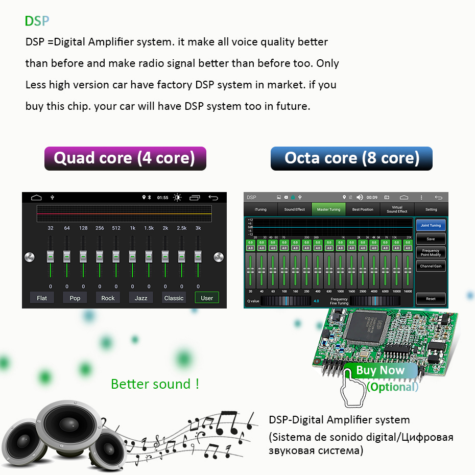 DSP-это цифровая система усилителя, она использует цифровой сигнал, она делает звук автомобиля лучше, чем раньше. PX5 и PX6 DSP-лучший DSP на рынке, пожалуйста, не беспокойтесь о количестве эквалайзера, пожалуйста, чувствуйте наше качество звука px5/px6 радио, это очень хорошо.