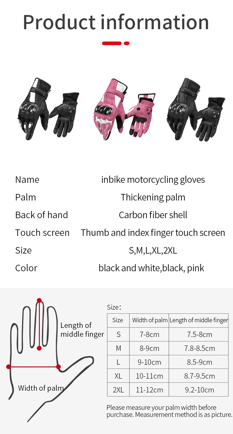 Название: перчатки для велоспорта inbike Ладонь: плотная Задняя часть: корпус из углеродного волокна Сенсорный экран: большой и указательный пальцы сенсорный экран Размеры: S,M,L,XL,2XL Цвет: черный, розовый