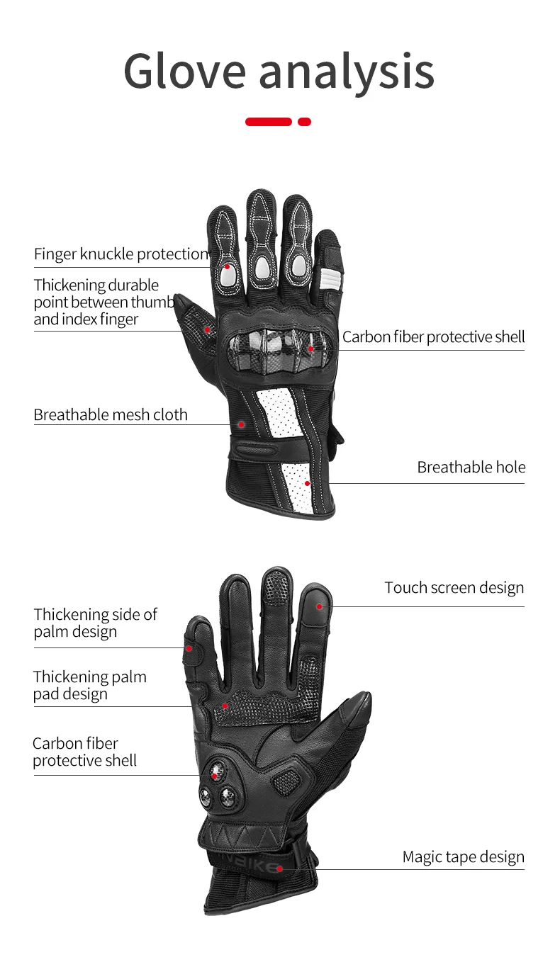 1. Защитный чехол из углеродного волокна; 2. Сенсорный экран с большим и утолщенным Пальцем; 3. Защитные накладки на суставы пальцев; 4. Уплотненные подушечки для рук; 5. Дышащая сетчатая ткань; 6. Прочная точка между большим и утолщенным Пальцем; 7. Регулируемая конструкция волшебной ленты 8. Перчатки для велоспорта 9. Корпус из углеродного волокна, дышащий и прочный 10. Сенсорный экран, модный, амортизирующий, противоскользящий, удобный и дышащий