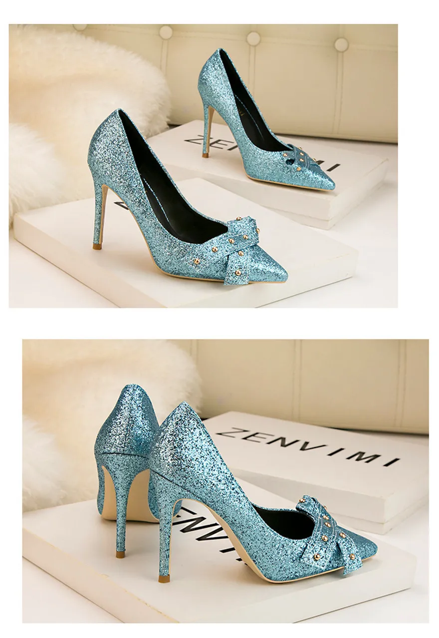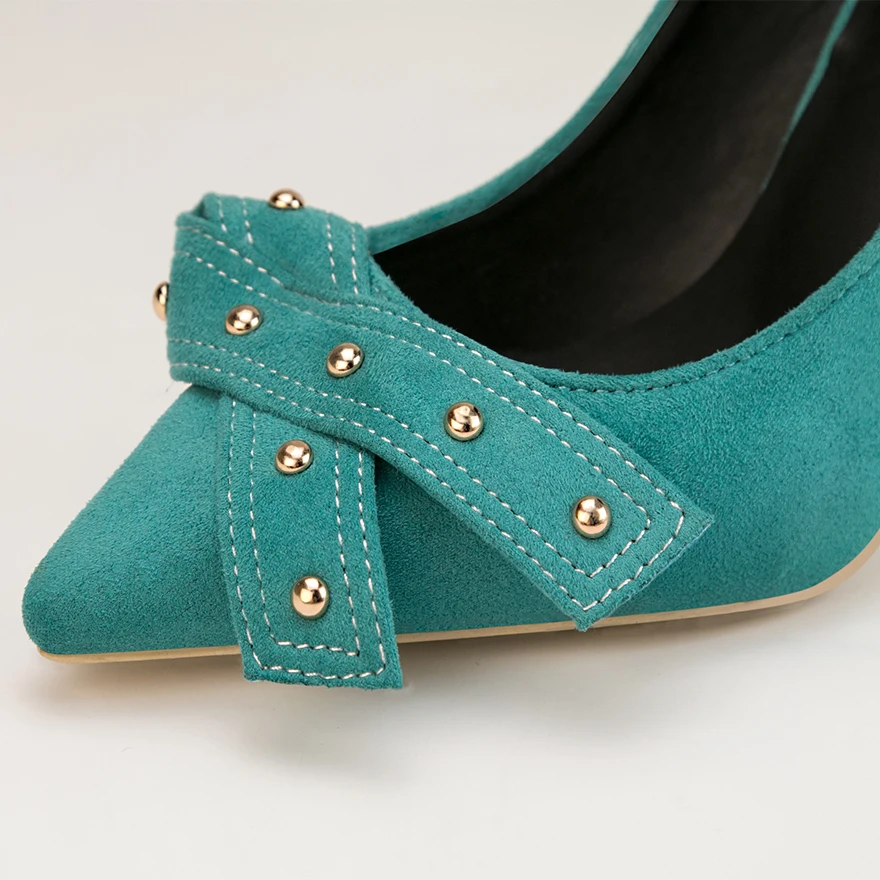 2 материала; Женские туфли-лодочки для работы; Популярная элегантная женская обувь с заклепками и бантом; Модельные туфли на тонком высоком каблуке; Женская офисная обувь