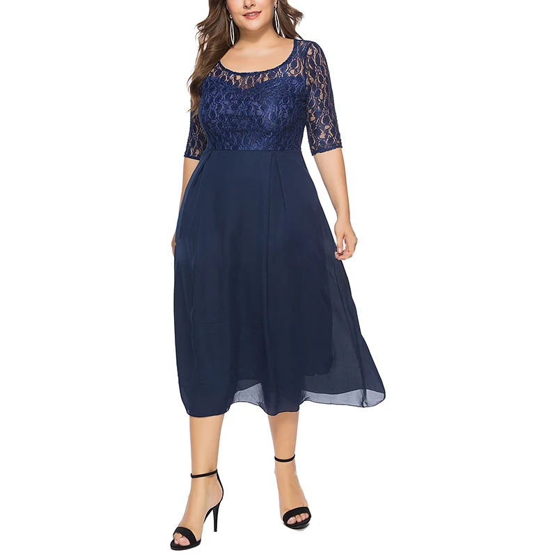 MIYU Повседневное плюс Размеры шифоновое лоскутное платье однотонное кружевное платье с О-образным вырезом с рукавом до локтя миди платье Темно-синие Для женщин 2019; сезон лето
