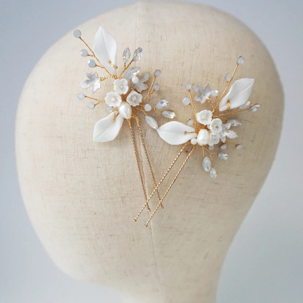 Свадебный глиняный цветок головной убор заколка для волос набор Стразы Золотые листья украшения для волос Модные женские вечерние аксессуары для волос 2019