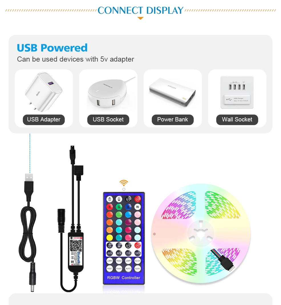 Когда вставьте светодиодную ленту в usb-порт телевизора, и иногда она не включается и не мигает, вы можете просто использовать универсальное настенное зарядное устройство usb 5 в 1A/2A для питания светодиодной ленты.