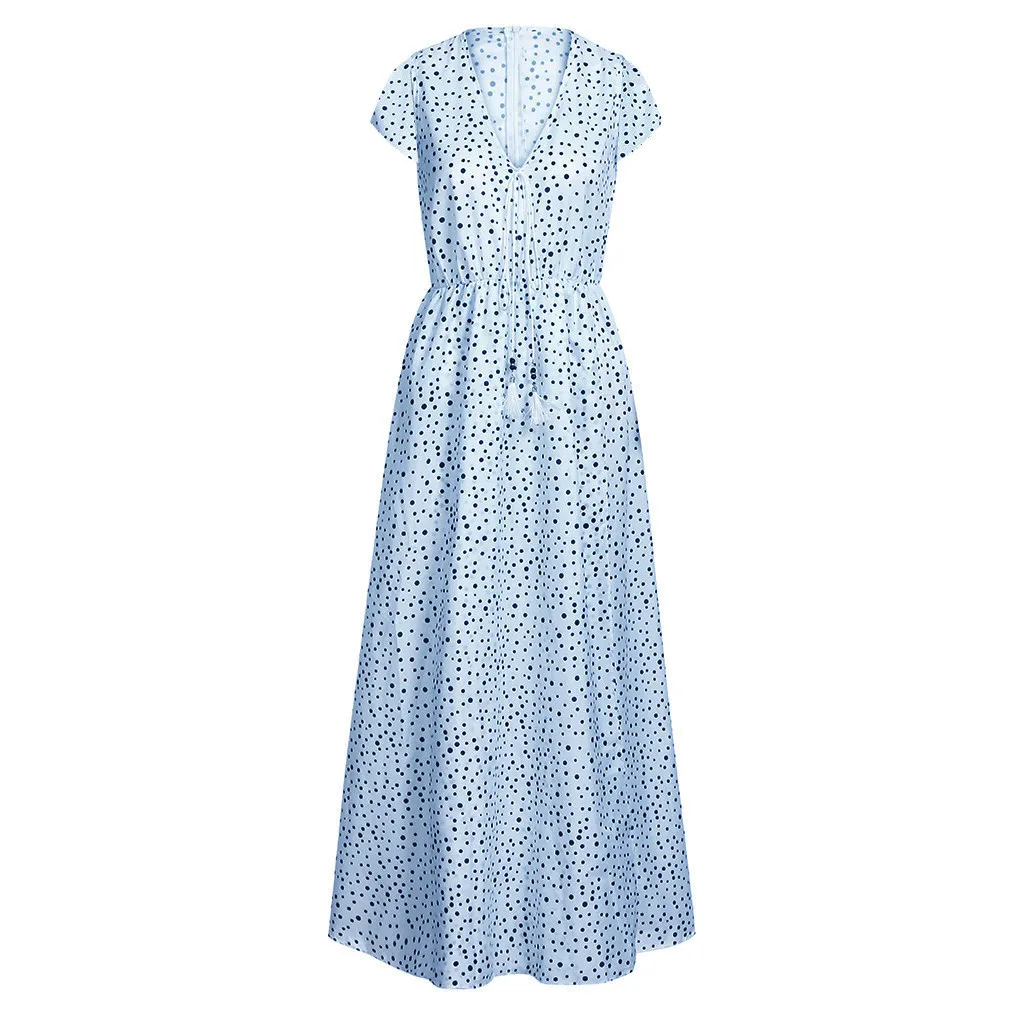 Женское летнее длинное платье в горошек с коротким рукавом и кисточками, с v-образным вырезом, Пляжное Платье Макси