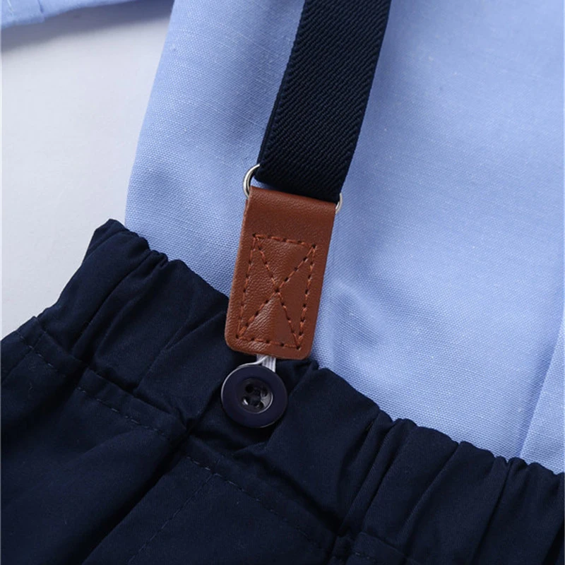 Поставляется с бантом, отстегивающимися y-образными подтяжками, которые могут застегиваться на пуговицы на поясе брюк. Красивый комплект, сделает вашего маленького мальчика маленьким джентльменом.