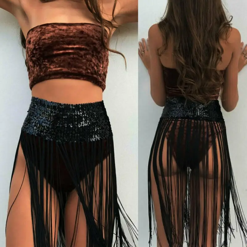 Многоцветная блестящая юбка для танца живота, гофрированная юбка с кисточками, Пляжное мини-платье