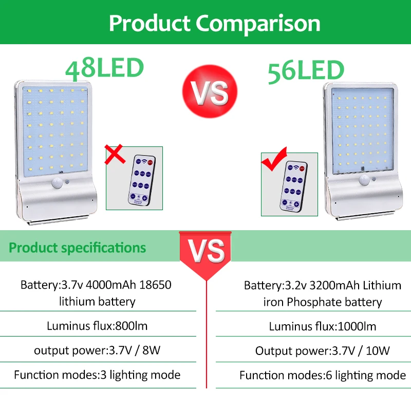 2. По сравнению со старыми 36 светодиодами, этот имеет 56 светодиодов и люменов может до 1000ЛМ, более яркое, чем большинство солнечных ламп
