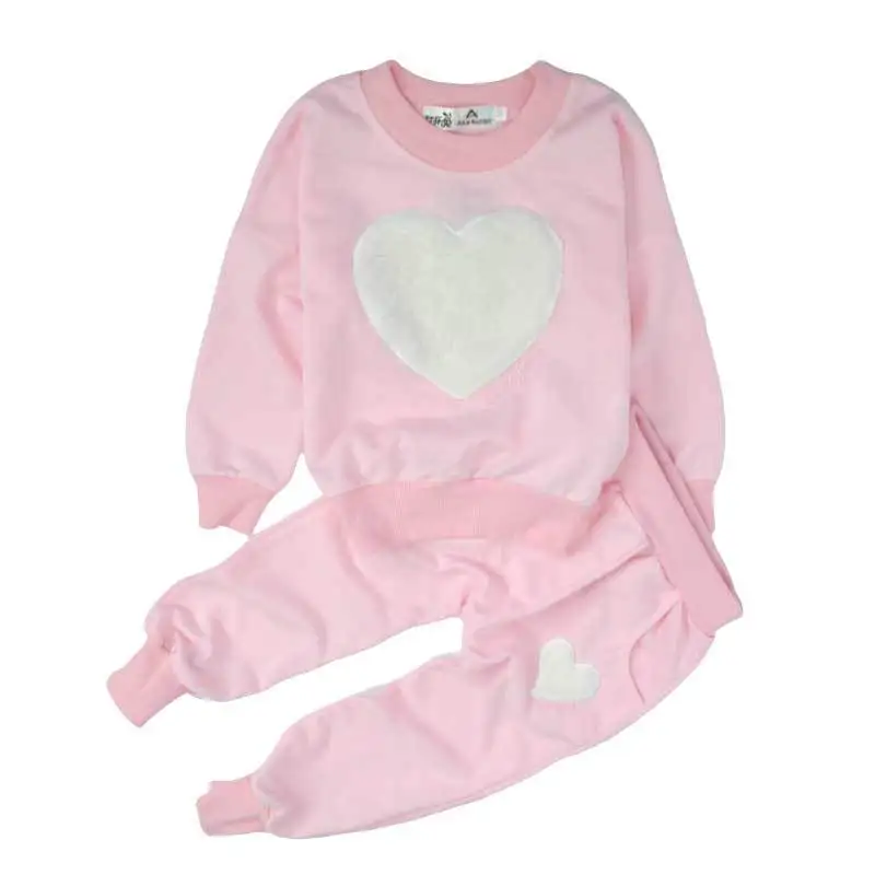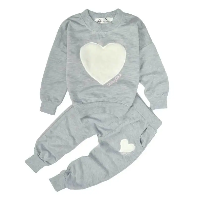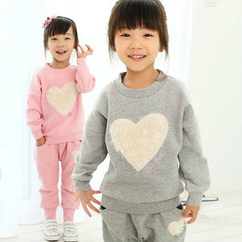 Лидер продаж 2015 комплекты для девочек костюм из футболки и штанов розового серого цвета с нашивкой в виде сердца одежда для детей домашний костюм спортивный костюм бесплатная доставка
