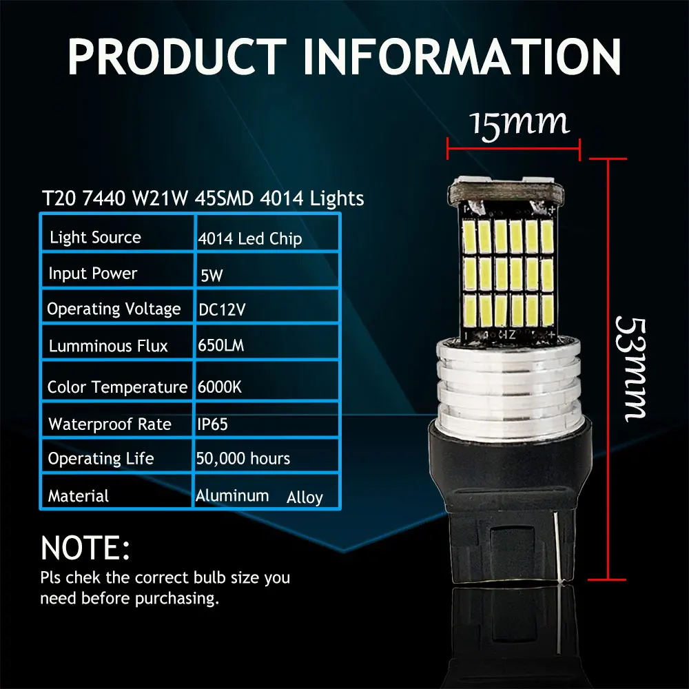 Светодиодный чип высокой мощности 4014 Новая светодиодная технология снижает энергопотребление на 40% до 80%. Алюминиевый корпус, высокая теплопроводность и красивый внешний вид. Светодиодные лампы имеют срок службы 50000 часов Легко установить, просто подключи и играй. Характеристики: Тип розетки: T20 7440 W21W WY21W Рабочее напряжение: 12 В постоянного тока Мощность: 5 Вт Люмен: 650 лм Светильник: белый Цветовая температура: 6000 К Угол свечения: 360 градусов Применение: Противотуманные фары/фары заднего хода, указатели поворота стоп-сигналы, дневные ходовые огни Примечание: 1. Пожалуйста, проверьте патрон и размер изделия, подтвердите, что эта лампа подходит для вашего автомобиля перед покупкой! 2. Так как Светодиодная лампа имеет + и-клеммы, поэтому, если после вставки в розетку нет освещения, просто замените клемму напротив 3. Когда лампа работает, очень высокая температура, будьте осторожны при замене, чтобы не обжечь руку! Посылка: Светодиодные лампы 2xT20 7440 W21W