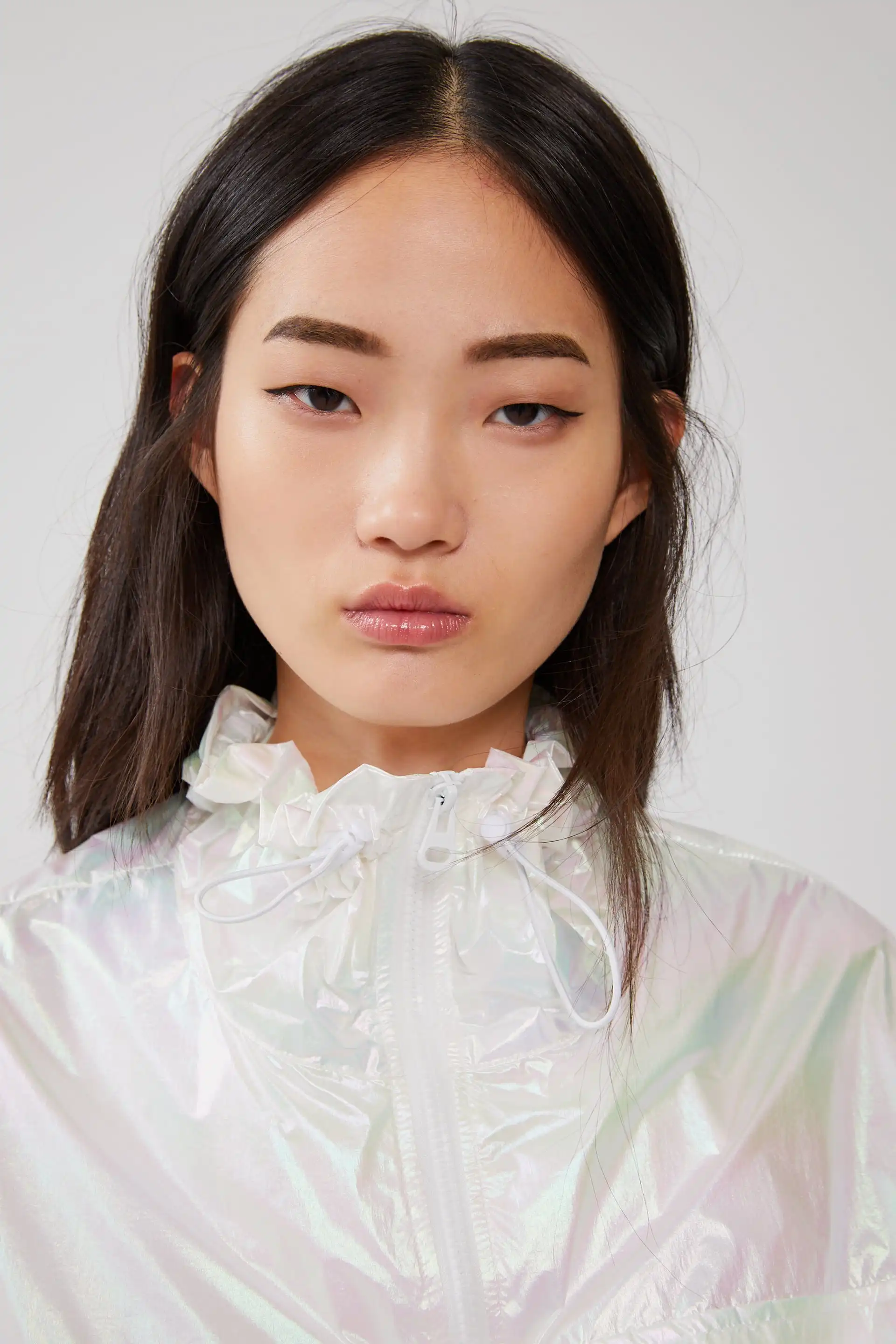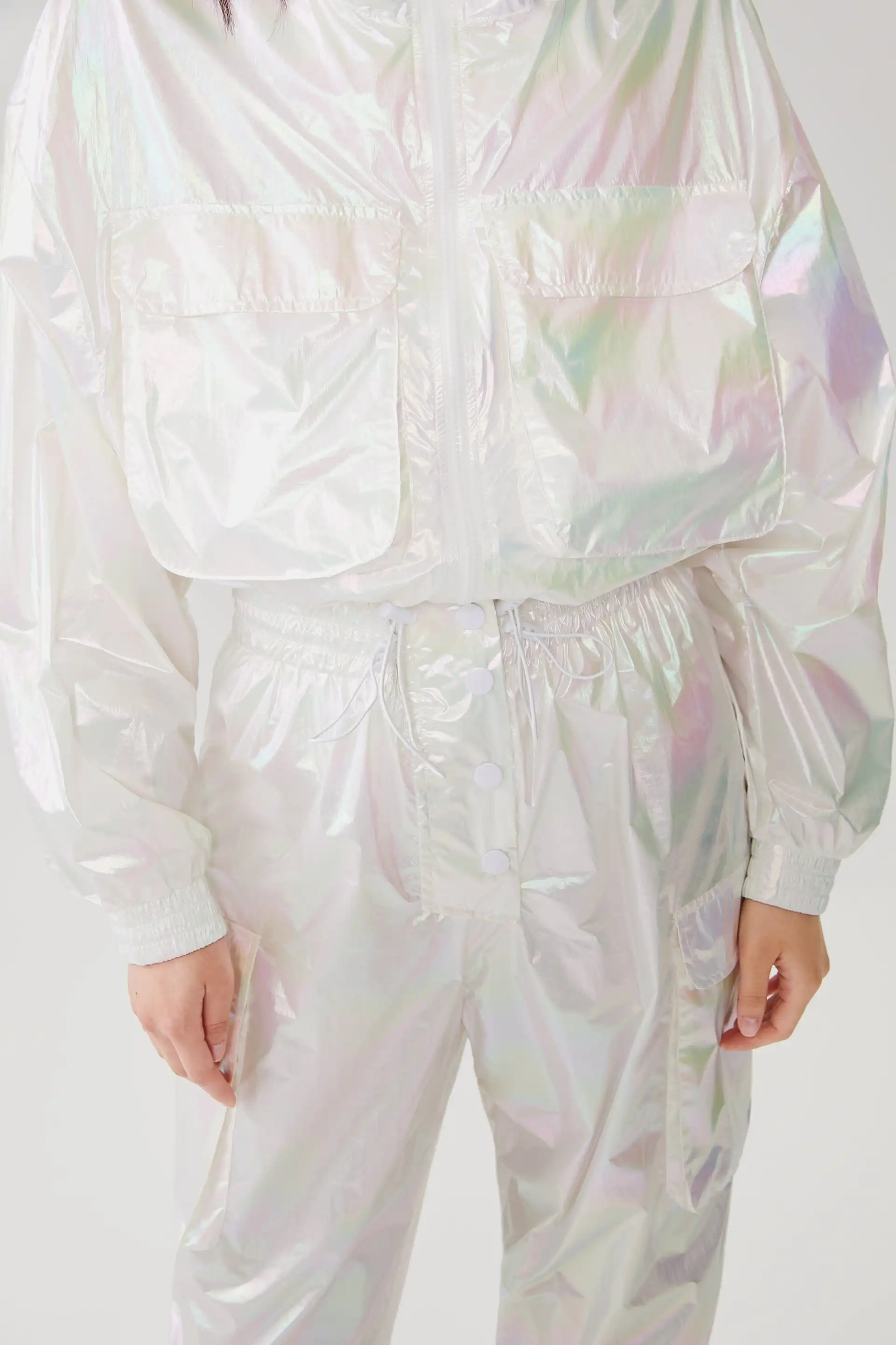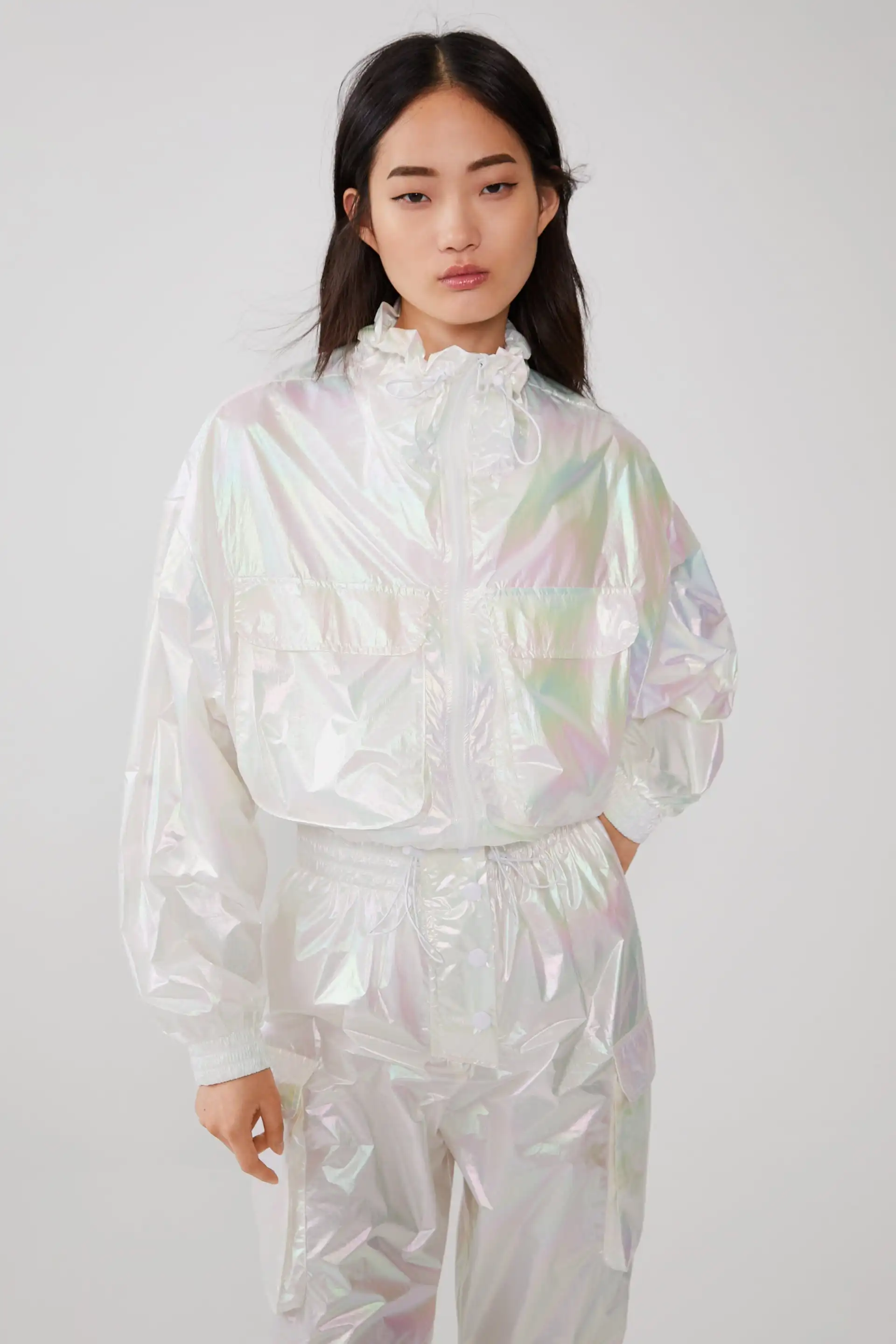 Переливающийся эффект куртка Детали Только одну сторону Короткая водостойкая куртка с регулируемым высоким воротником на шнурке, длинными рукавами и эластичными манжетами. Передние накладные карманы с клапаном. Регулируемая кулиска по нижнему краю. Застежка-молния спереди.