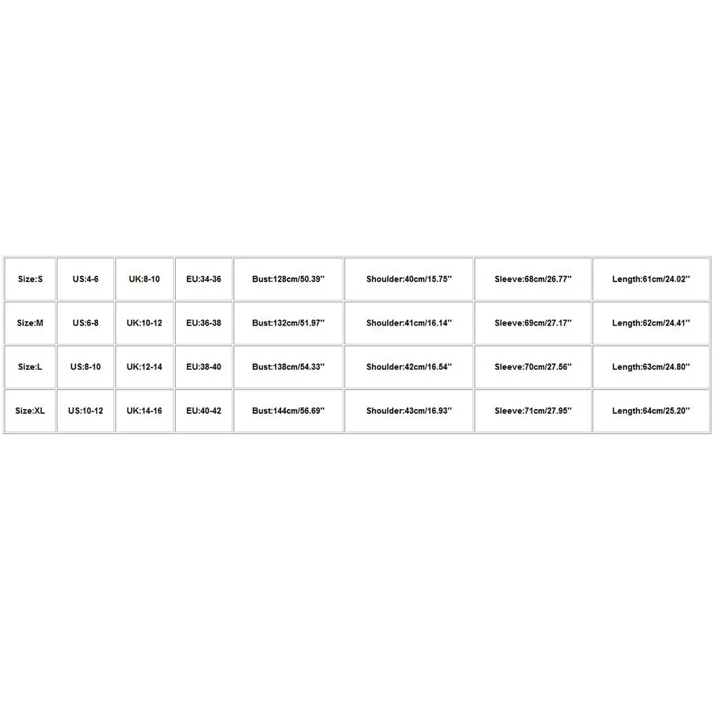 | Размер: XL | США: 10-12 | Великобритания: 14-16 | ЕС: 40-42 | Обхват груди: 144 см/56,69 дюйма | Ширина плеч: 43 см/16,93 дюйма | Рукав: 71 см/27,95 дюйма | Длина: 64 см/25,20'' |