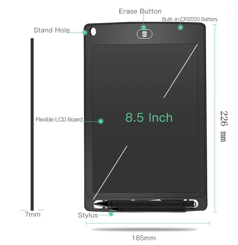Мягкий цвет, без вреда для глаз, без излучения. Подходит для письма и рисования. Чувствительный к давлению, легко использовать и играть. Четкий экран с одной кнопкой. Ультра тонкий и легкий дизайн, удобно носить с собой. CR2020 сотового аккумулятора. Нет Кнопка блокировки экрана