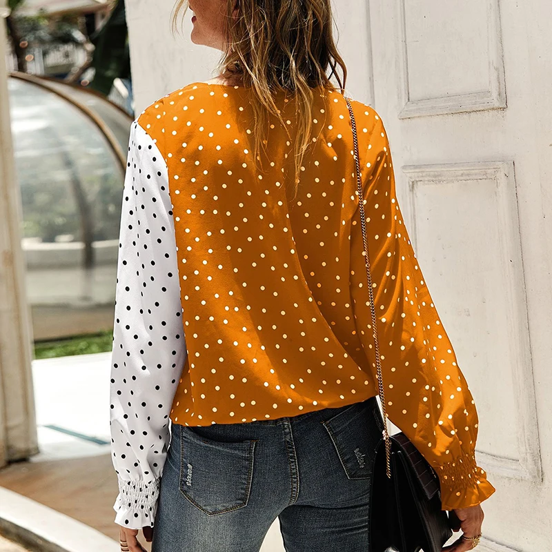 Осенняя Блузка женская с v-образным вырезом, с волнистым вырезом, с длинными рукавами, контрастного цвета, Повседневная Туника с рукавами три четверти de moda 2019