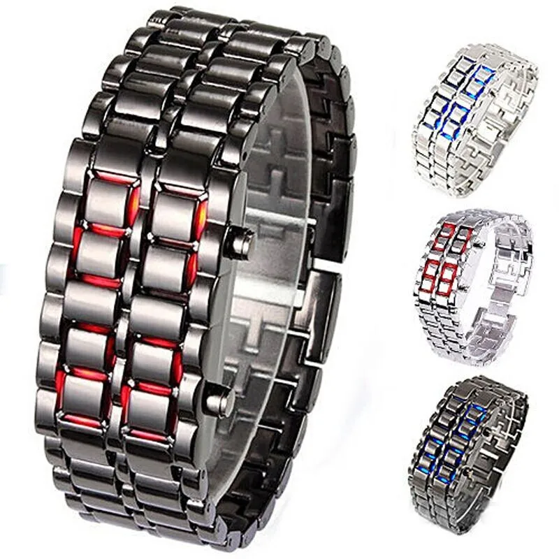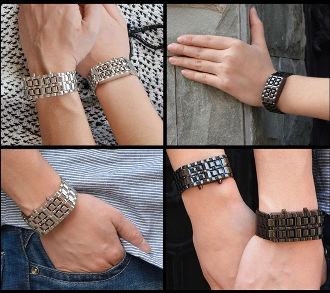 Settings: Time, Date, Seconds (Watch looks like a common metal bracelet at normal conditon, time will be displayed just like lava while LED is lighting)