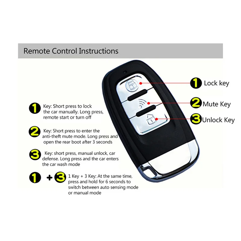 Одна клавиша для запуска PKE, Индукционная система защиты от кражи Основные особенности 1, дистанционное управление автоматически блокируется Закрытое место для парковки: автоматический замок PKE, более 2 метров от автомобильного автоматического дверного замка, кнопка автоматического запуска автомобиля (не может запускать автомобиль), логотип в Твите 2, удаленное разблокирование автоматически ХУМ, ПКЕ разблокировка автоматически: рядом с автомобилем в пределах 1,5 метров от двери разблокировка или вытяжка дверь до двери светильник дважды (опционально) разблокировка двери, блокировка автоматически поднимает темные рожки автомобиля 2 B, разблокировка вручную, а затем нажмите на пульт дистанционного управления на 2 автомобильных рожках, разблокировка Центрального управления С, вы можете использовать ключ, чтобы начать нормальную функцию (автомобиль может быть начат) 3, функция удаленного запуска ХУМ, пульт дистанционного управления может дистанционно управлять запуском автомобиля или вылетом (вы должны открыть режим запуска встречи) B, нажмите на пульт дистанционного управления в течение 3 секунд, функция удаленного запуска, запуск двигателя (Центральный замок по-прежнему блокируется) C, время удаленного запуска 10 минут 4, функция открытого режима именования A, P файл или стояночный нейтраль (запуск двигателя) Установите стояночный тормоз, нажмите кнопку, чтобы запустить кнопку запуска в течение 2 секунд, затем кнопка загорается медленно. B, выйти из дома после использования пульта дистанционного управления нажмите и удерживайте кнопку дистанционного управления в течение 4 секунд, чтобы выключить функцию запуска и блокировки автомобиля, чтобы завершить прием. 5, интеллектуальная функция переключения Если автомобиль был дистанционным запуском, а затем разблокирован пульт дистанционного управления, ножной тормоз, тогда система сразу же выйдут из режима запуска и запустится в режим передачи. 6, Подсказка о низком напряжении Если вы слышите звуковой сигнал 5 раз после каждой разблокировки. Описание напряжение батареи пульта дистанционного управления слишком низкое. Необходимо немедленно заменить аккумулятор на пульт дистанционного управления. 7. Аварийный режим Эм, в разблокированном состоянии, нажмите кнопку запуска в течение 10 секунд, также можете запустить автомобиль B, в разблокированном состоянии, первый шаг на ножной тормоз, и нажмите кнопку разблокировки пульта дистанционного управления в течение 4 секунд, вы можете запустить автомобиль. 8, ключ для запуска работы 1, нажмите на педаль тормоза, нажмите кнопку запуска на 1 секунду, запуск автомобиля напрямую 2. Если не наносить ножной тормоз, нажмите кнопку запуска, включите ее, и она будет выключена. 3. Для парковки, торможения ног нажмите кнопку запуска на 1 секунду, подавление автомобиля. Если вы не нажимаете кнопку запуска, 4 секунды, удалите автомобиль. 9, функция вибрации Когда состояние противоугонной системы автомобиля прекратится через 5 секунд, если автомобиль три раза ударился, вибрация подаст сигнал. 10, замок для вождения Когда автомобиль начинается через 15 секунд, подавляет тормозную стопу, центральный замок, пламя автоматически разблокируется Уважаемые клиенты, при покупке этого продукта мы рекомендуем профессиональным инженерам для установки, чтобы избеж