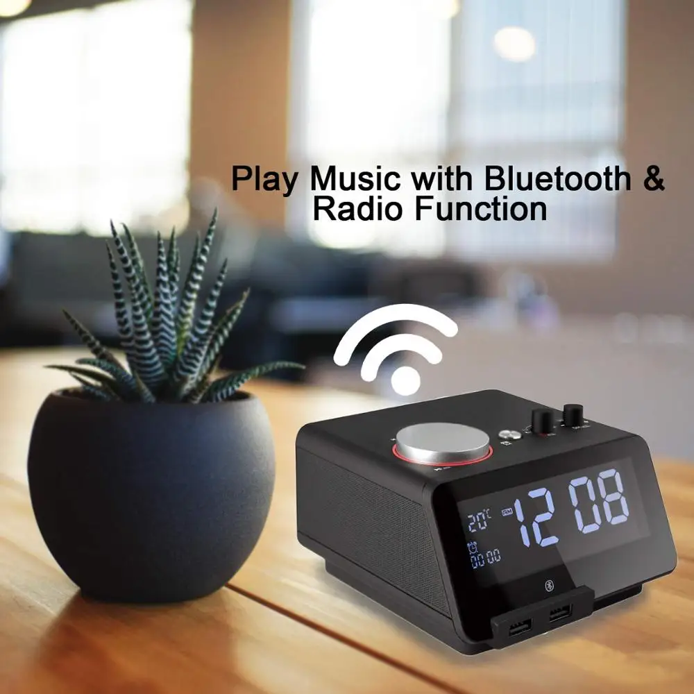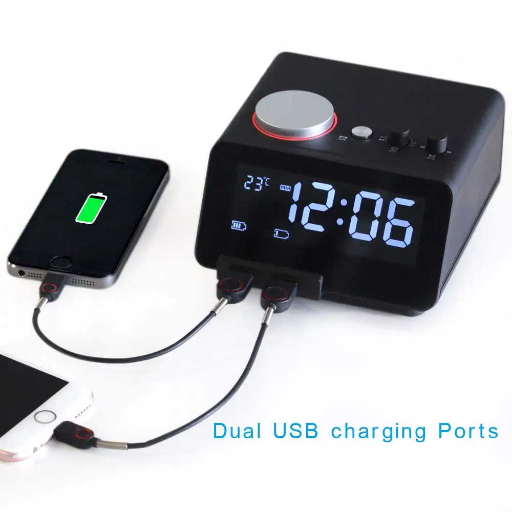 Поддерживает 2 порта USB для зарядки, с защитой от перегрузки по току, перенапряжения и короткого замыкания для зарядки телефона iPhone, iPad, телефона Android и других устройств с питанием от USB. Благодаря функции bluetooth вы можете легко подключиться к телефону. И вы можете зарядить свой телефон и наслаждаться любимыми песнями на разных устройствах, как портативный динамик одновременно.