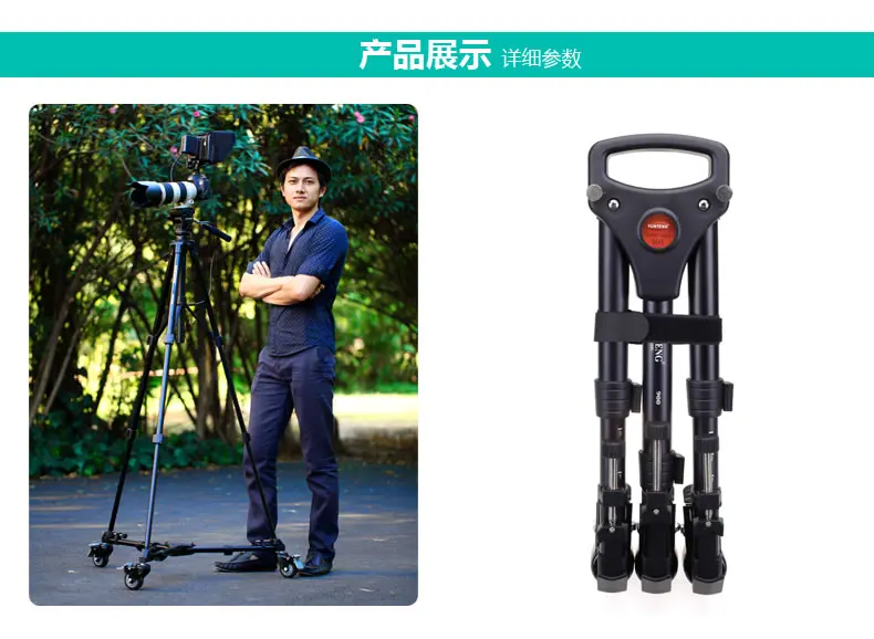 Yunteng YT-900 для фотостудии сверхмощный штатив Долли с колесами и креплением для Canon Nikon Sony DSLRУниверсальный штатив-тележка YUNTENG YT-900 представляет собой простой и доступный способ крепления штатива на колесах. Грузоподъемность до 33 фунтов/15 кг. Регулируемые зажимы надежно фиксируют ноги любого размера штатива. Крепление штатива легко: просто выровняйте каждую ногу штатива и закрутите винты большого пальца, чтобы затянуть каждый зажим. Две ножки складываются, чтобы создать компактную упаковку для транспортировки? Dolly складки до всего 17x4,8 "/431x123mm. Тележка YUNTENG 900 отлично подходит для съемки в студии или на поле, или для видеосъемки.Особенности:1. Подходит для большинства цифровых камер и видеокамер.2. С умеренным весом, это идеальный компаньон для вашей камеры во время путешествия.3. Супер гибкие ножки для легкого позиционирования, даже на неровной и шероховатой поверхности.4. Эта Съемная быстро устанавливаемая панель легко крепится к камере.5. Регулируемые ножки от 30 см до 43 см, с калибровкой на ногах, проще в использовании.6. Изготовлен из прочного алюминиевого сплава, максимальная нагрузка до 15 кг.Технические характеристики:Бренд: Штативная головка YuntengМодель: Штативная головка YUNTENG YT-990Материал: алюминиевый сплав и пластикДиаметр шара: 2 "/5 смДлина: 430 ммУдлиненная Длина: 884 ммДиаметр трубки: 28 ммMinium расстояние трубки: 56 смМаксимальное расстояние между трубками: 78 смГрузоподъемность: около 15 кгВес/педикюра задняя часть: около 1,7 кгПосылка:1 x Универсальный штатив YUNTENG 900Чехол для переноски (1 шт.);Отгрузка Если вы живете в отдаленной области и выбрали бесплатную DHL или бесплатную Fedex, пожалуйста, позвольте нам изменить вашу посылку, чтобы она была отправлена почтой. Мы не гарантируем время доставки на все международные поставки из-за различий в сроках таможенного оформления в отдельных странах, что может повлиять на то, как быстро ваш продукт проверяется. Обратите внимание, что покупатели несут ответственность за все дополнительные таможенные сборы, брокерские сборы, пошлины и налоги на импорт в вашу страну. Эти дополнительные сборы могут быть собраны во время доставки, мы не вернем стоимость доставки за отклоненные поставки. Возврат Мы вернем вам деньги, если вы вернете товар в течение 15 дней с момента получения товара по любой причине. Однако покупатель должен убедиться, что возвращенные товары находятся в их первоначальном состоянии. Если товары повреждены или утеряны, когда они возвращаются, покупатель будет нести ответственность за такой ущерб или потерю, и Мы не дадим покупателю возврат средств. При возврате товара Покупатель несет расходы за обратную доставку. Перед возвратом товаров, пожалуйста, подтвердите обратный адрес и метод логистики с нами после того, как вы дадите товары логистической компании, пожалуйста, отправьте нам номер отслеживания. Отзывы Ваше удовлетворение и положительные отзывы очень важны для нас. Пожалуйста, оставьте положительные отзывы и 5 звезд, если вы удовлетворены нашими товарами и обслуживанием. Если у вас есть какие-либо вопросы с нашими товарами или обслуживанием, пожалуйста, не стесняйтесь связаться с нами, прежде чем оставлять негативные отзывы. Мы постараемся сделать все возможное, чтобы решить их и сделать вас удовлетворенными. Цвет несоответствие Различия в цвете могут быть вызваны некото