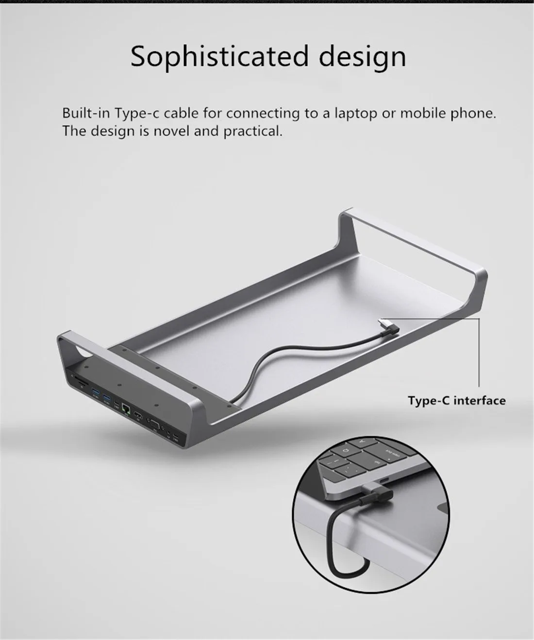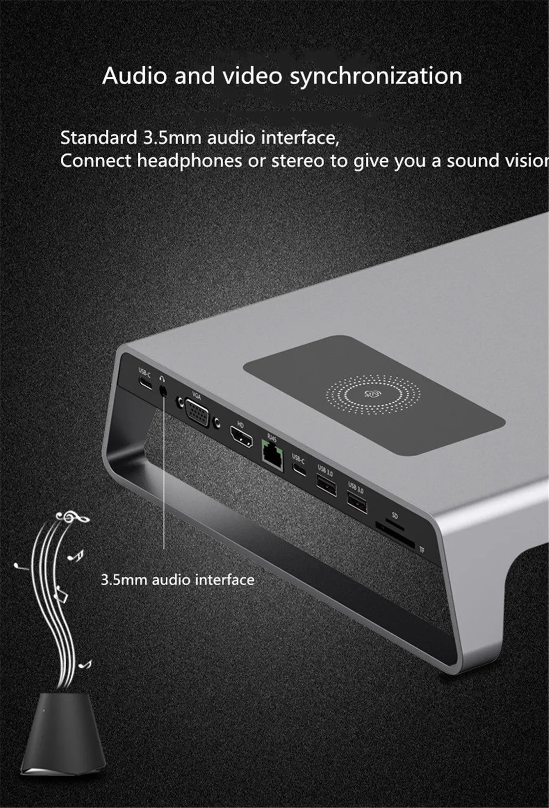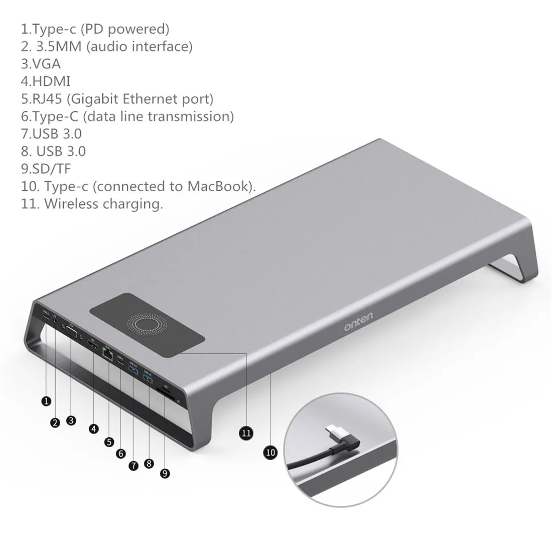 1.* 2019 latest compact design: Built-in Type-c cable, connected to laptop or mobile phone, the design is novel and practical. Plug and play, simple and fast. 2.*Wireless charging: Wireless charging function, support Android/Apple mobile phone wireless charging, making charging more convenient and quick. 3.*4K HD display: 3840*2160 resolution, the picture quality is more delicate, the big screen connection is clearer, and the cinema visual effect is conceived. 4.* Wireless Multifunction Extension Base: 4K HD/Wireless Charging/Video Conversion/Data Transmission/ NIC function / card reading / PD power supply. 5.* Multiple interfaces are used at the same time: support all interfaces to use at the same time, office, game, video, no need to wait. If the hub is connected to multiple high-power devices, an external power supply is required. Model: OTN-95109 Name: Type-C multi-function expansion base Material: aluminum alloy Line length: 220mm Video output: HDMI, VGA Resolution: 4K Working temperature: 0 °C + 45 °C Storage environment: -10°C to + 55°C Function interface: 1: Type-c (PD power supply, if the hub is connected to multiple high-power devices, you need to connect external power supply.) 2: 3.5MM (audio interface) 3: VGA 4: HDMI 5: RJ45 (Gigabit Ethernet port) 6: Type-C (data line transmission) 7: USB 3.0 8: USB 3.0 9: SD/TF 10: Type-c (connected to MacBook). 11: Wireless charging. Multiple interfaces are used at the same time: support all interfaces to use at the same time, office, game, video, no waiting. Laptop with the same screen display: laptop connected to the large screen display, you can experience the high-definition big-screen visual feast, watching video and playing games more fun. Accessories: 1.Type-C multi-function expansion base. (Notebook, mobile phone, mouse, keyboard device without image display) 2. High-grade packaging 3. Instructions