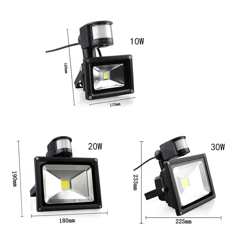 Infrared sensorDie-casting Aluminum lamp body is anti-rust and durable.New Sensor:More sensitive; detection distance up to 12 meters; Waterproof coefficient from IP44 to IP65, The new protruding adjustment knob can prevent rainwater into the sensor. Reflector:Larger reflective surface, Contrasting smooth reflector, it reduces useless light reflections and refraction,at the same power, the brightness is higher.Perfect for landscape lighting, stage fountain cast light, building lighting, billboard lighting, hotels, bars, etc.Widely used in lighting up your garden, garage, underground, basement, warehouse. Specification: Type:Infrared sensor LEDSpotlightMaterial: Aluminum Quantity: 1pcsItem Color: As shownLight Color:Cool White Power: 10W 20W 30W Voltage:220VWaterproof: IP66 Package: 1 x Waterproof LED Spotlight