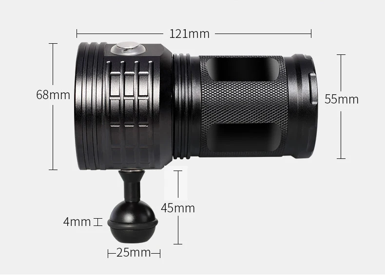 Спецификация: 1 Режим Porudc: QX14-4 многофункциональная подводная съемка, Характеристики: легкий, портативный, легко работать с двумя переключателями, водонепроницаемый дизайн, глубина погружения около 80 м Светодиодный источник: 6 шт. 9090 белый цвет 4 * XML2, 4 шт. XPE красный R5,4 шт. XPE синий R5, Модель белого переключателя: высокий, средний, низкий, удерживайте в течение 2 секунд Красный, синий Модель: красный, красный стробоскоп, Буле, двойной щелчок красный светильник сильный стробоскоп, удерживайте в течение 2 секунд Объектив изделия: 6 мм двойное покрытие и твердое стекло из поликарбоната Светильник Тип чашки: без отражателя, светильник излучается от самолета Материалы: авиационный алюминиевый сплав Белый цвет температура: 6000K Красный: 620 нм Синий: 455m, Угол луча: 120 градусов Класс IP: IPX8 Тип переключателя: пресс-переключатель Обработка поверхности: Третичное твердое Анодное окисление Светящийся: 9090 белый цвет 4 * XML2, 4 шт. красный R5/240lm,4 шт. синий R5/240lm Расстояние освещения: 300-500 м Спецификация батареи: 4*18650 (включая) Рабочая Напряжение: 3,7 V Цвет: черный Глубина погружения: 80 м Спецификация: держатель лампы L122mmx диаметр 65 мм, диаметр хвоста 55 мм Упаковка: фонарик, кронштейн, уплотнительное кольцо, коробка (Сферический кронштейн необходимо приобрести отдельно) Есть QX14-4,QX14-7 и QX27 для опции, разница, как показано ниже, другие одинаковы