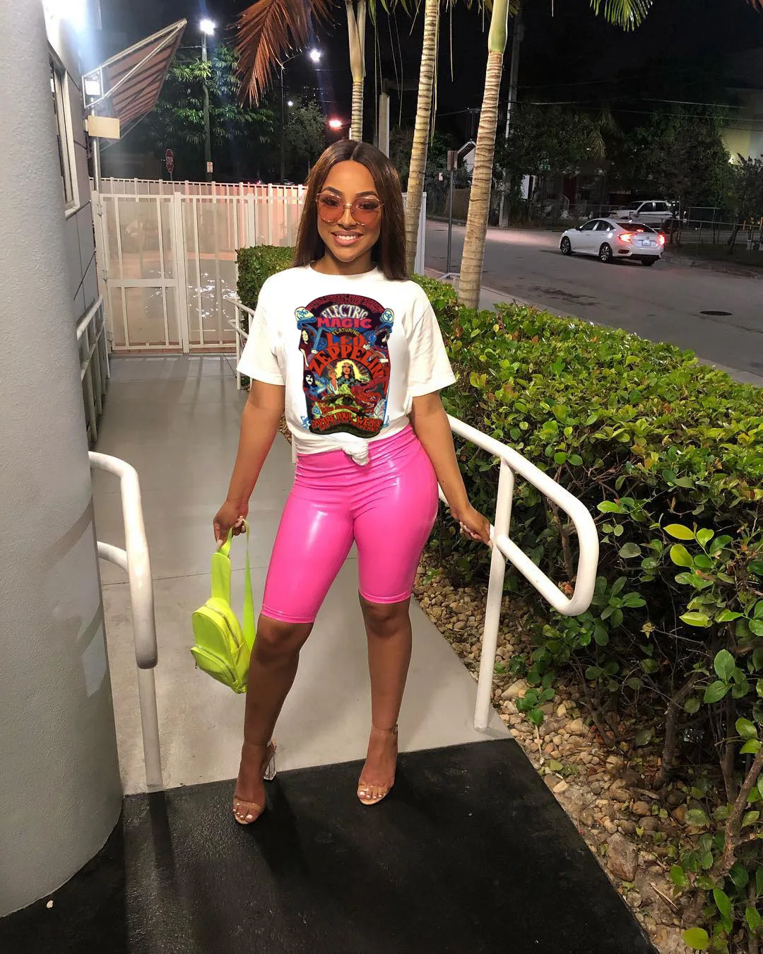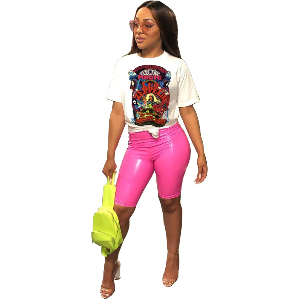 Женский Повседневный костюм из двух предметов, белая футболка с мультяшным принтом и буквенным принтом + розовые штаны из искусственной кожи до колена, комплект из 2 предметов
