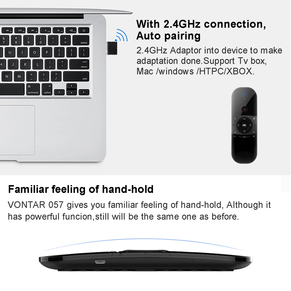 Название бренда: Wechip Номер модели: W1 Коробка передач и Управление: 2,4 ГГц Беспроводная Количество ключей: 57 Расстояние дистанционного управления: до 10 м Батарея: встроенный 3,7 V 300mAh литиевая батарея Батарея Рабочий ток: <9 мА Ток в режиме ожидания: <25uA Функция ИК-обучения: Да CPI (скорость движения указателя мыши) Регулировка: Да Автоматический Режим сна и пробуждения: Да Материал: пластик + силикон Цвет: черный Главный пункт Размеры: 15,8*5,5*1,6 см/6,22*2,17 * 0.65in Основной вес изделия: 86 г/3,04 унций Посылка Размеры: 18,0*9,5*1,8 см/7,08*3,74 * 0.70in Вес посылка: 137 г/4,84 унций