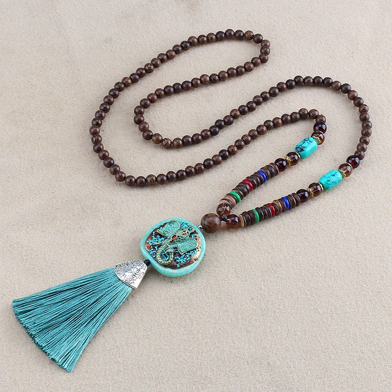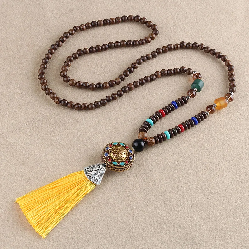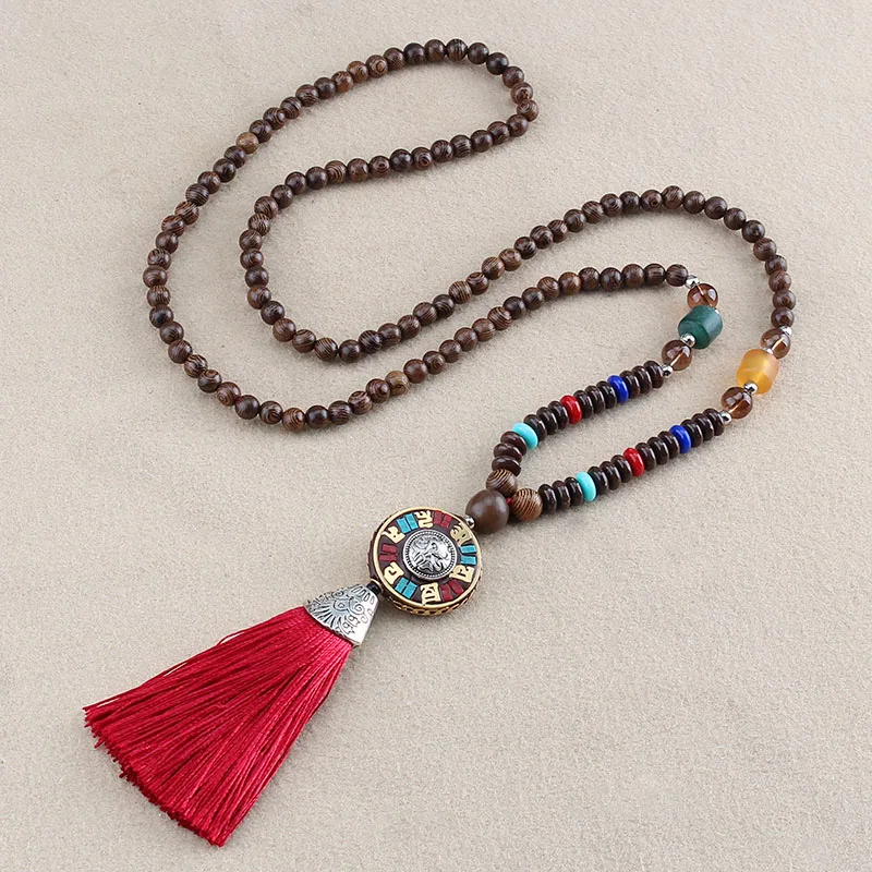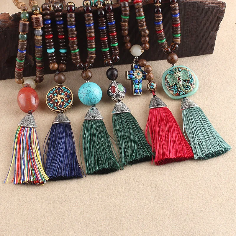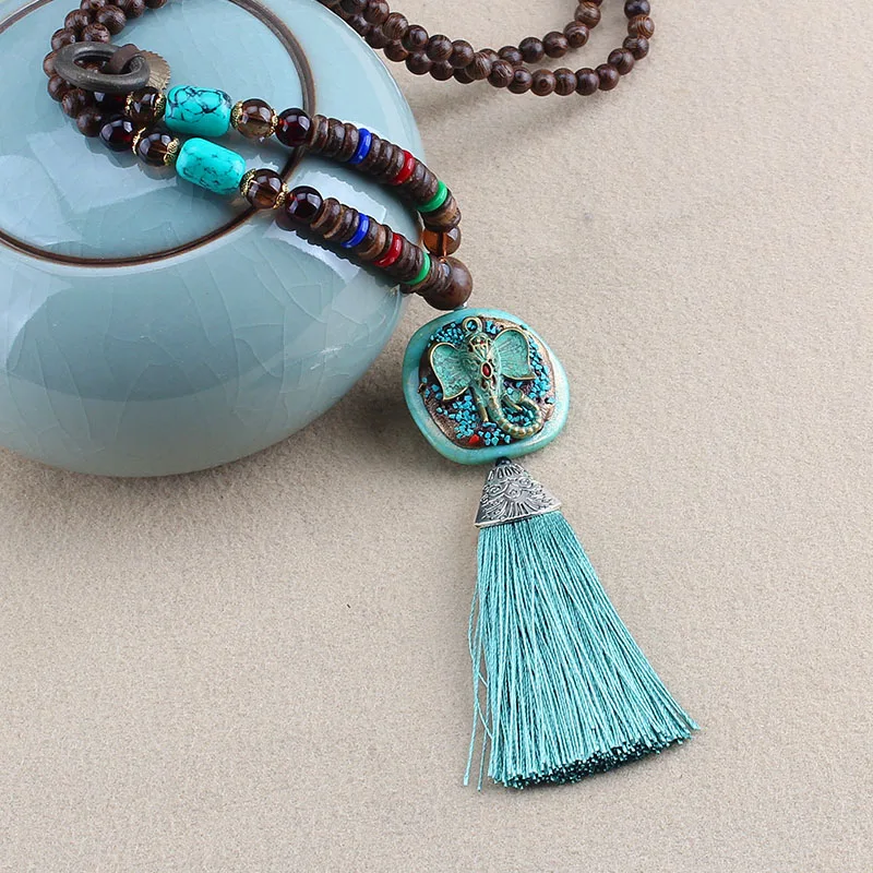 Богемные длинные кисточки, ожерелье для женщин с бахромой, винтажные массивные деревянные бусы, подвески в стиле бохо, слоны, ожерелья, OM Yoga, этнические ювелирные изделия