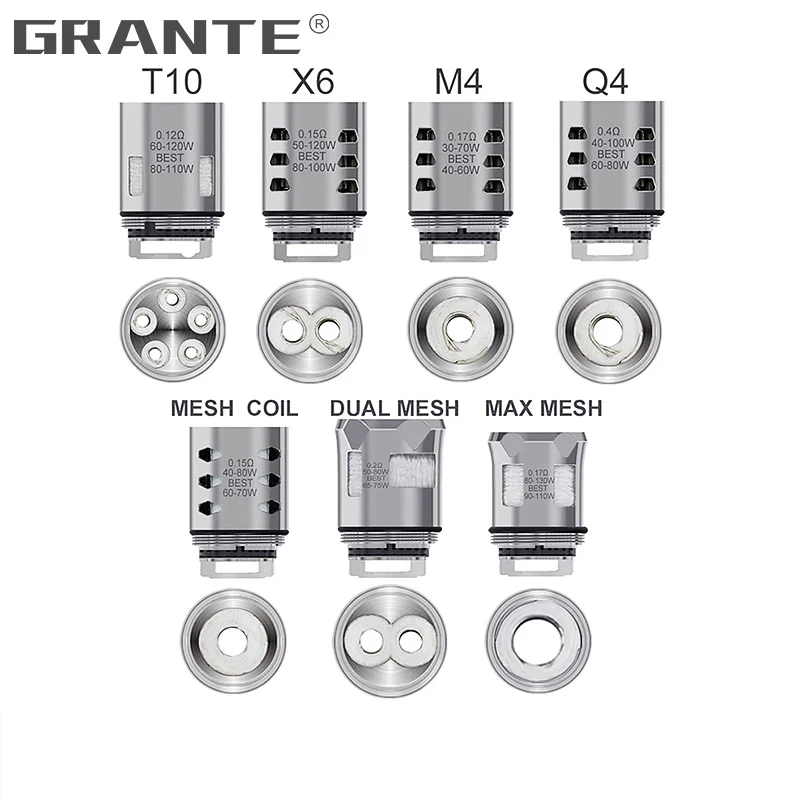 V12 принца из сетчатого материала: Сильная мощность и огромное производство пара 0,15 Ом 40 Вт-80 Вт/лучшее: 60 Вт-70 Вт V12 Prince Max сетка: Сильная мощность и огромное производство пара V12 Prince Двойная Сетка: Сильная мощность и огромное производство пара V12 Prince-T10: Приносит вам массивный пар и богатые вкусы 0,12 Ом Decuple катушки 60 Вт-120 Вт/лучшее 80 Вт-110 Вт V12 Prince-X6: Приносит вам шелковистый вкус и массивный пар 0,15 Sextuple катушки 50 Вт-120 Вт/лучшее 80 Вт-100 Вт V12 Prince-M4: Применимо к механические mod Придает шелковистый и насыщенный вкус облаков 0,17 Ом Четырехместный катушки 30 Вт-70 Вт/Лучший 45 Вт-55 Вт V12 Prince-Q4: Приносит вам глубокий и насыщенный пар 0.4ohm Четырехместный катушки 40 Вт-100 Вт/Лучший 60-80 Вт