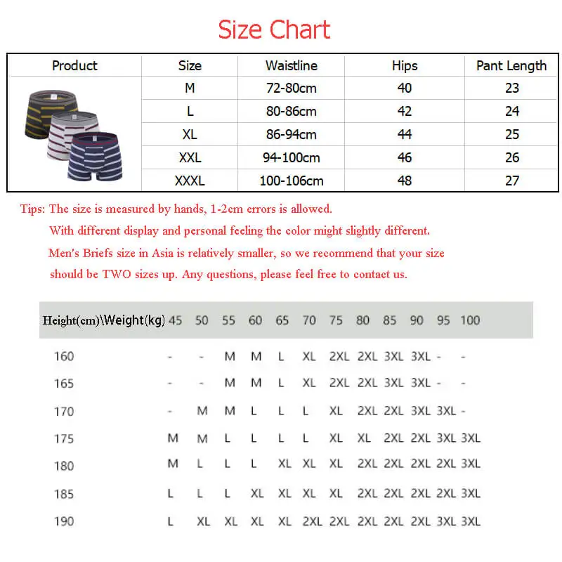 Примечание: 1. Мужские трусы размера в Азии относительно меньше, мы рекомендуем мужчинам заказывать на два размера больше. 2. Размер измеряется вручную, допускается погрешность в 1-2 см. 3. С различными экранами, дисплеями и личными ощущениями цвет может немного отличаться.