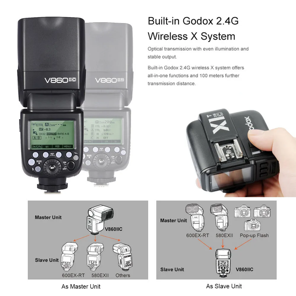 Встроенная беспроводная система Godox 2,4G X, совместимая с передатчиком X1T-C для достижения беспроводного управления, расстояние передачи 100 м.