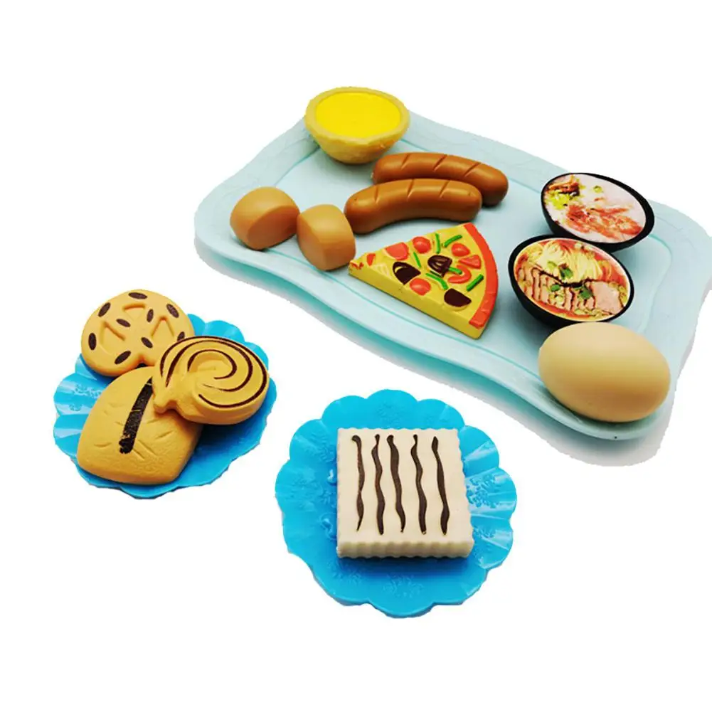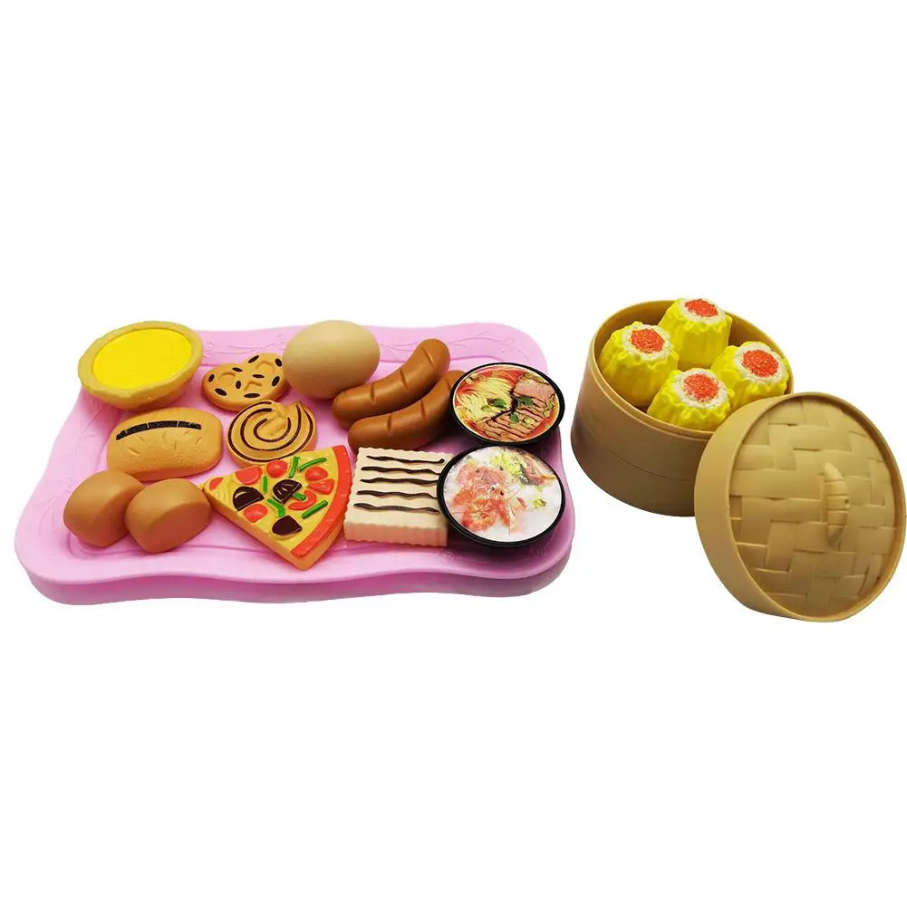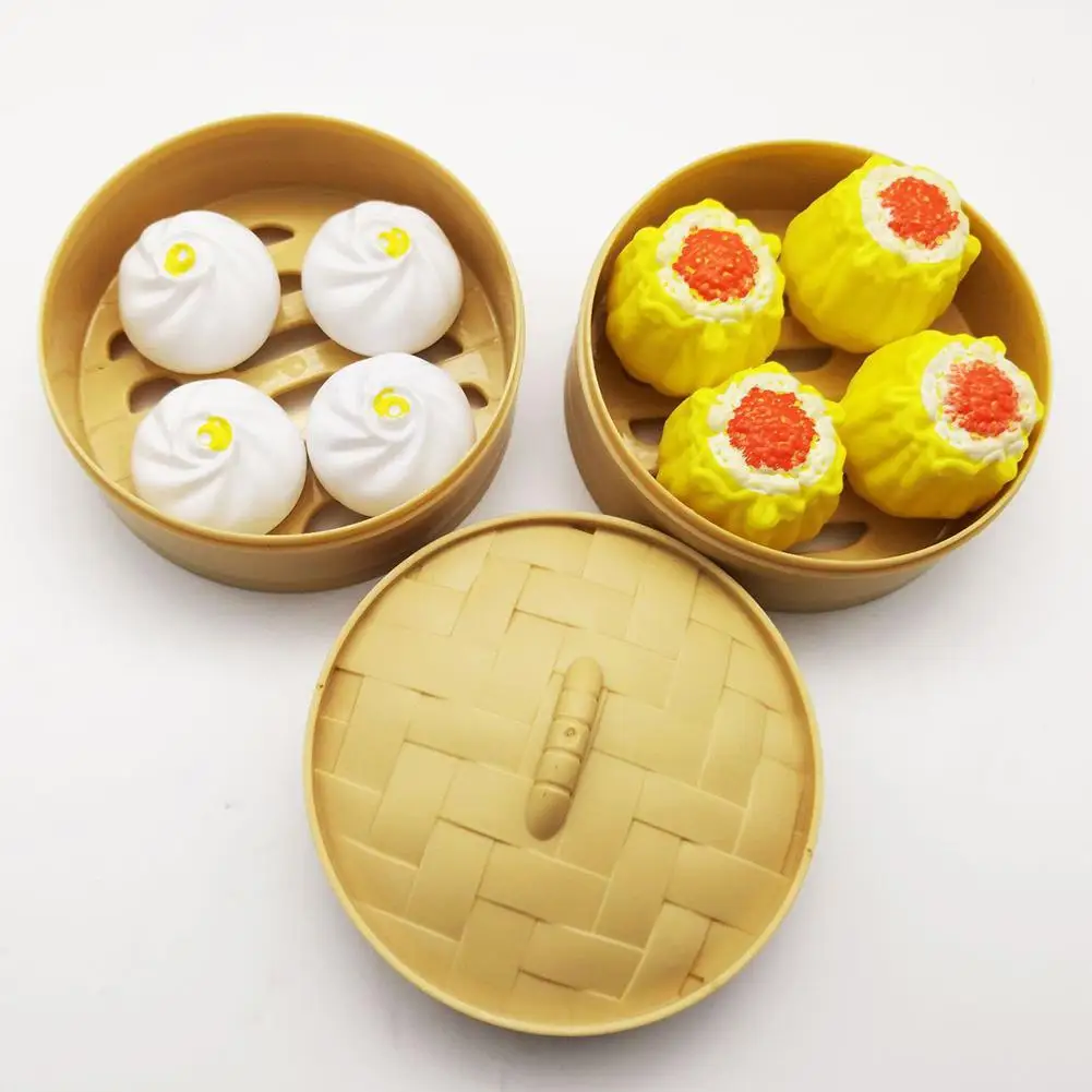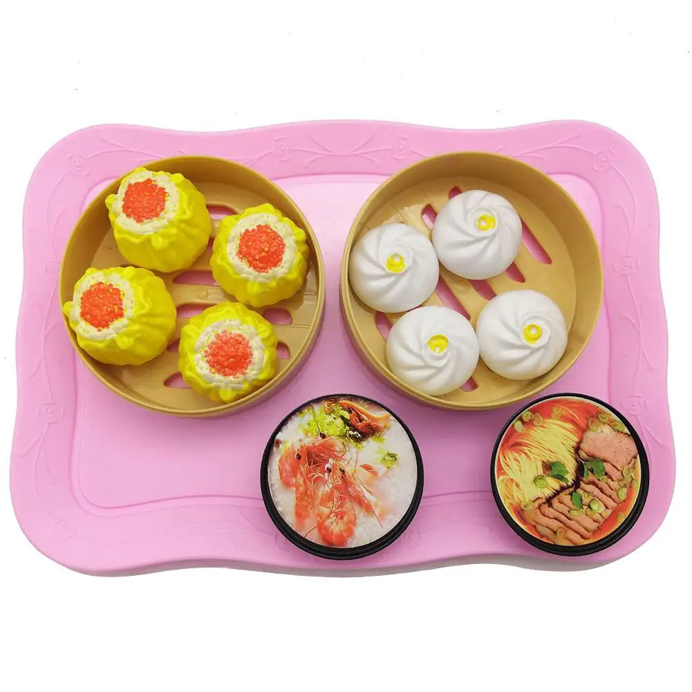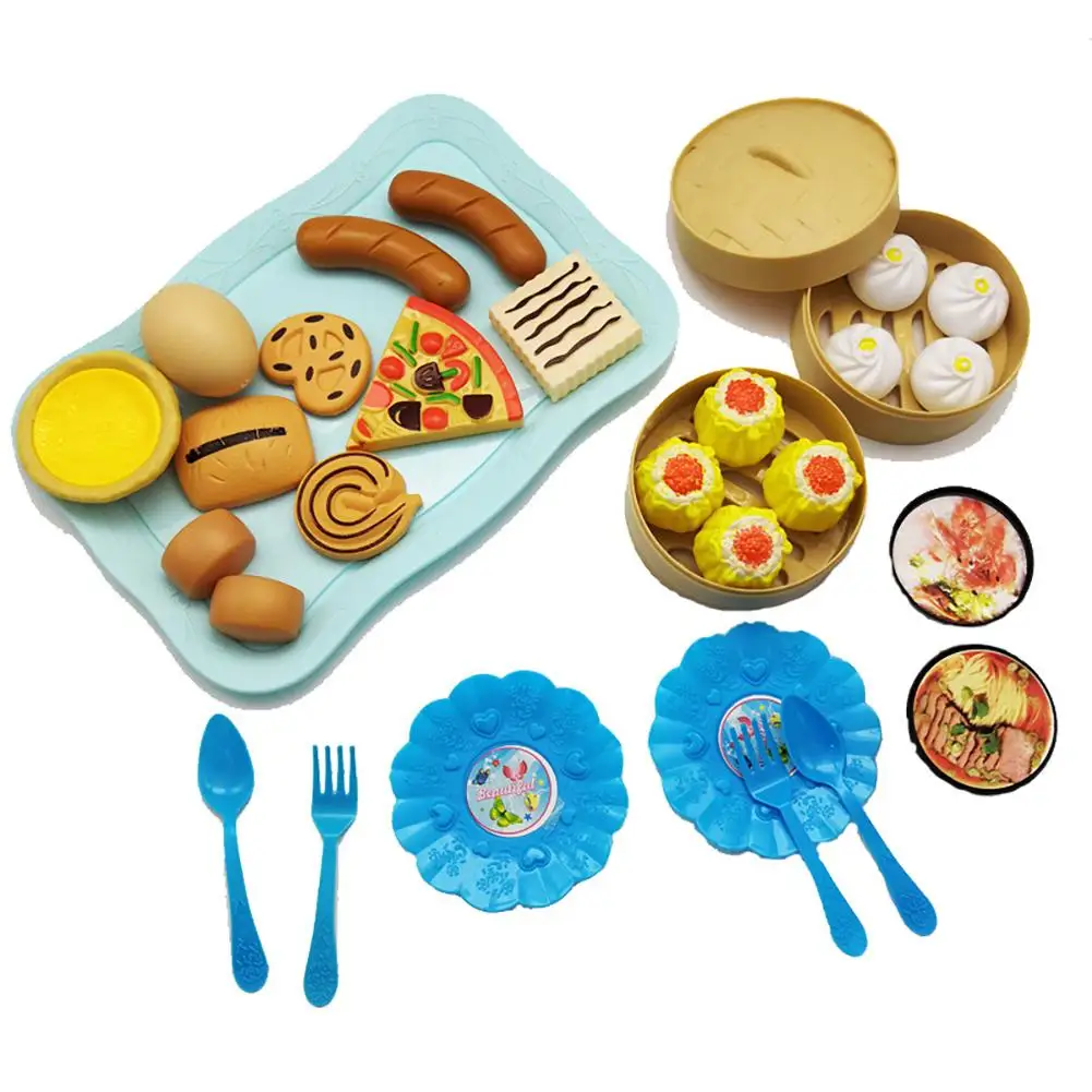 2 steamers, 1 steamer lid, 2 ham sausages, 2 small steamed buns, 3 cookies, 4 buns, 4 sizzling, 2 bowl noodles, 4 forks, 2 plates, large tray, cake , pizza, eggs, egg tarts