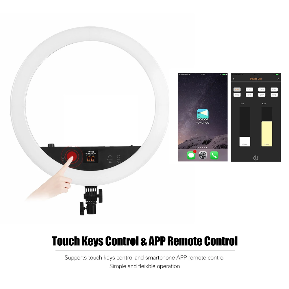 Светодиодный кольцевой светильник YONGNUO YN808 для видеосъемки, 22 дюйма, 800 с, светодиодный светильник для студии с управлением через приложение и двойным блоком питания, светодиодный светильник для видеосъемки 48 Вт