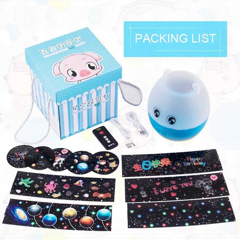 Вес изделия: 848 г (включая упаковку) Цвет изделия: розовый, синий, розовый Размер изделия: 18*19 см Размер упаковки: 20*20 см Вес упаковки: 18 шт/кор Конфигурация продукта: лампа проектора, зарядная линия 1,2 м, аудио линия 1 м, Инструкция на китайском и английском языках, проекционная Фигура 6, пульт дистанционного управления 1.