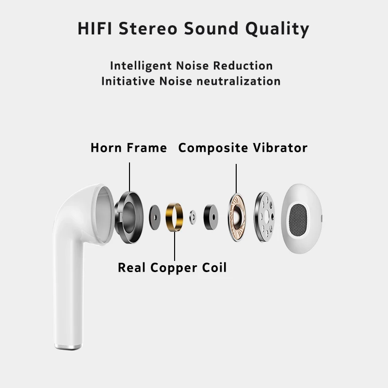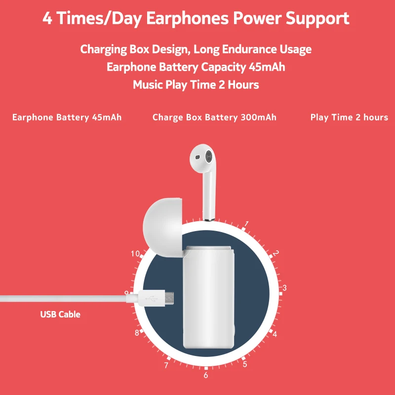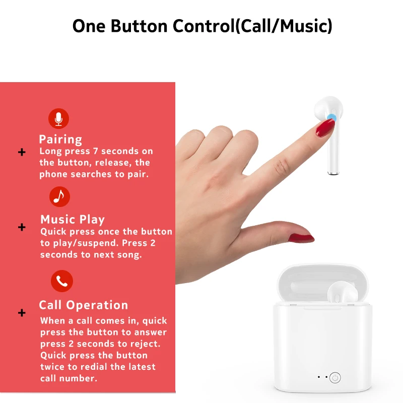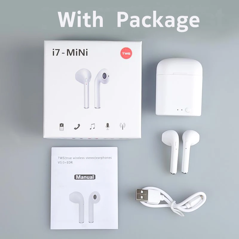 1. Driver: 15mm 2. Impedance: 32 OHM 3. Bluetooth version: Bluetooth v5.0 + EDR 4. Bluetooth use band: 2.4GHz 5. Power level: CLASS II 6. Output power: 30mW 7. Bluetooth distance: 10 meters barrier 8. Frequency response: 20-20000Hz 9. Operating voltage range: 3.0V-4.2V 10. Mic sensitivity: -42dB 11. With A2DP / AVRCP high quality stereo audio transmission and remote control protocol 12. Powerful noise de-noising circuit (active noise reduction) 13. switch between Chinese and English (boot does not connect Bluetooth state, press the switch 2 times, hear the tone switch successfully) 13. Talk time is about 2-3 hours 14. music time about 2-3 hours 15. Standby time is about 100 hours Package Includes: 2 x i7 mini tws bluetooth earphones (left and right earphones) 1 x Charging box 1 x USB Charging Cable 1 x User Manual Pls pay attention this link has two option for choice With package and no package .