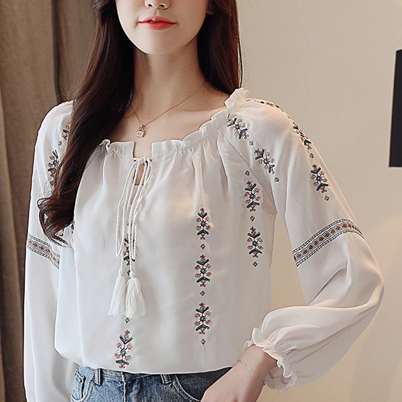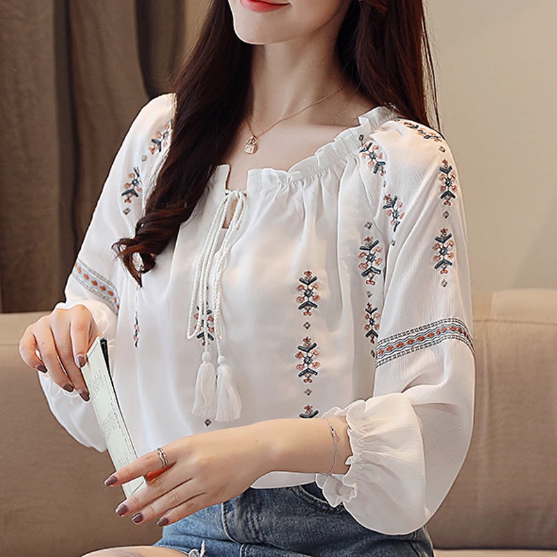 Женская шифоновая блузка с длинным рукавом вышивкой|Рубашки| |