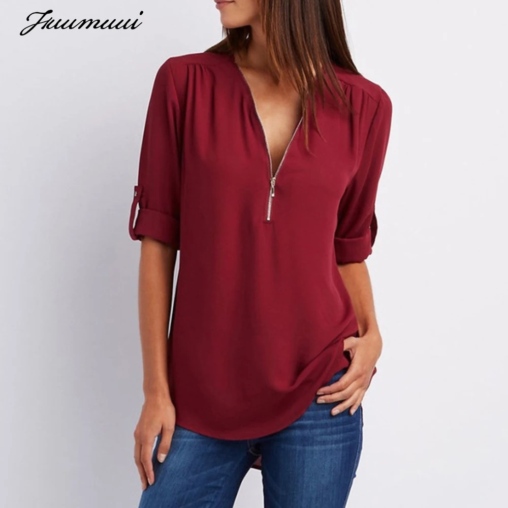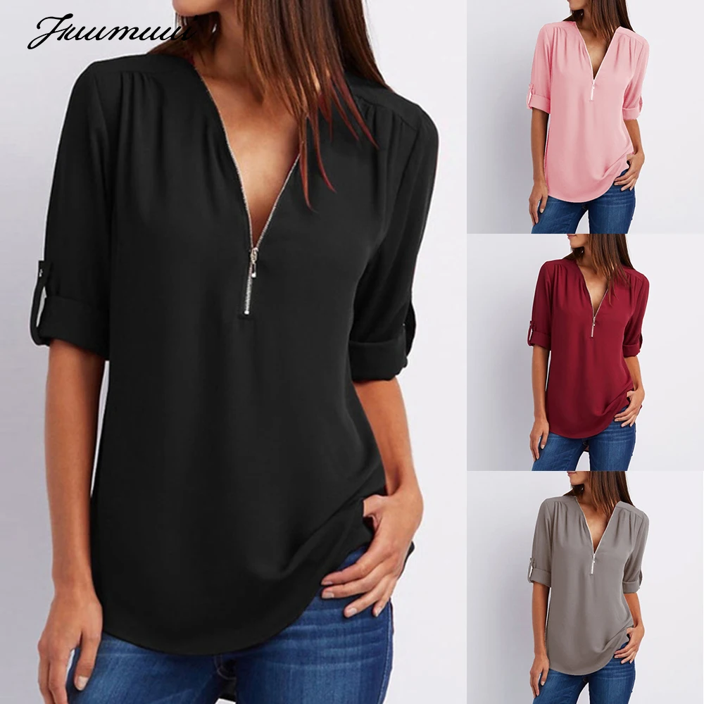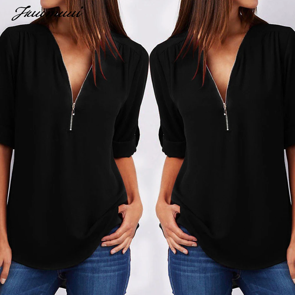 Наименование товара: Fuumuui, однотонные женские блузки на молнии, одежда, Сексуальная Повседневная футболка с v-образным вырезом и длинным рукавом, шифоновая женская блузка, топы, большие размеры