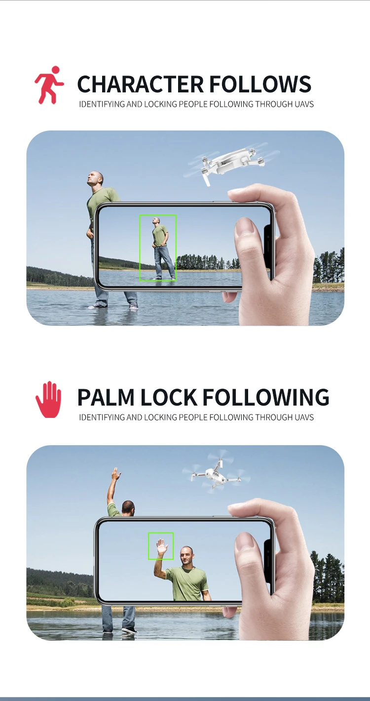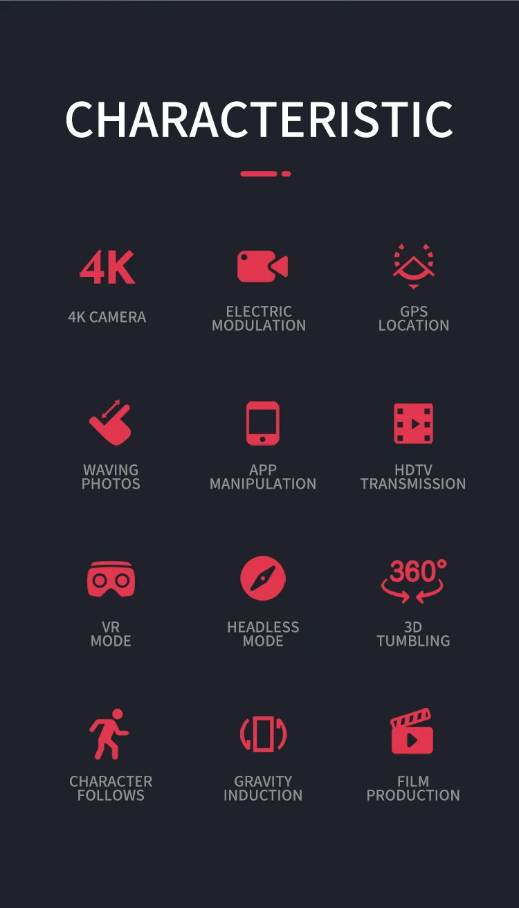 Складной, запуск одной кнопкой, посадка одной кнопкой, удержание высоты, постоянная оптическая подача, двойная камера, подключение Wi-Fi, управление приложением, фото жестов, запись жестов, IPP Inteiiigent, следующий режим me, управление ладонями (вверх влево вправо), полет в пути, точки заинтересованности, скорость? ? Контроль, передача в реальном времени, MV изображение и видео обмен, GPS возврат домой.